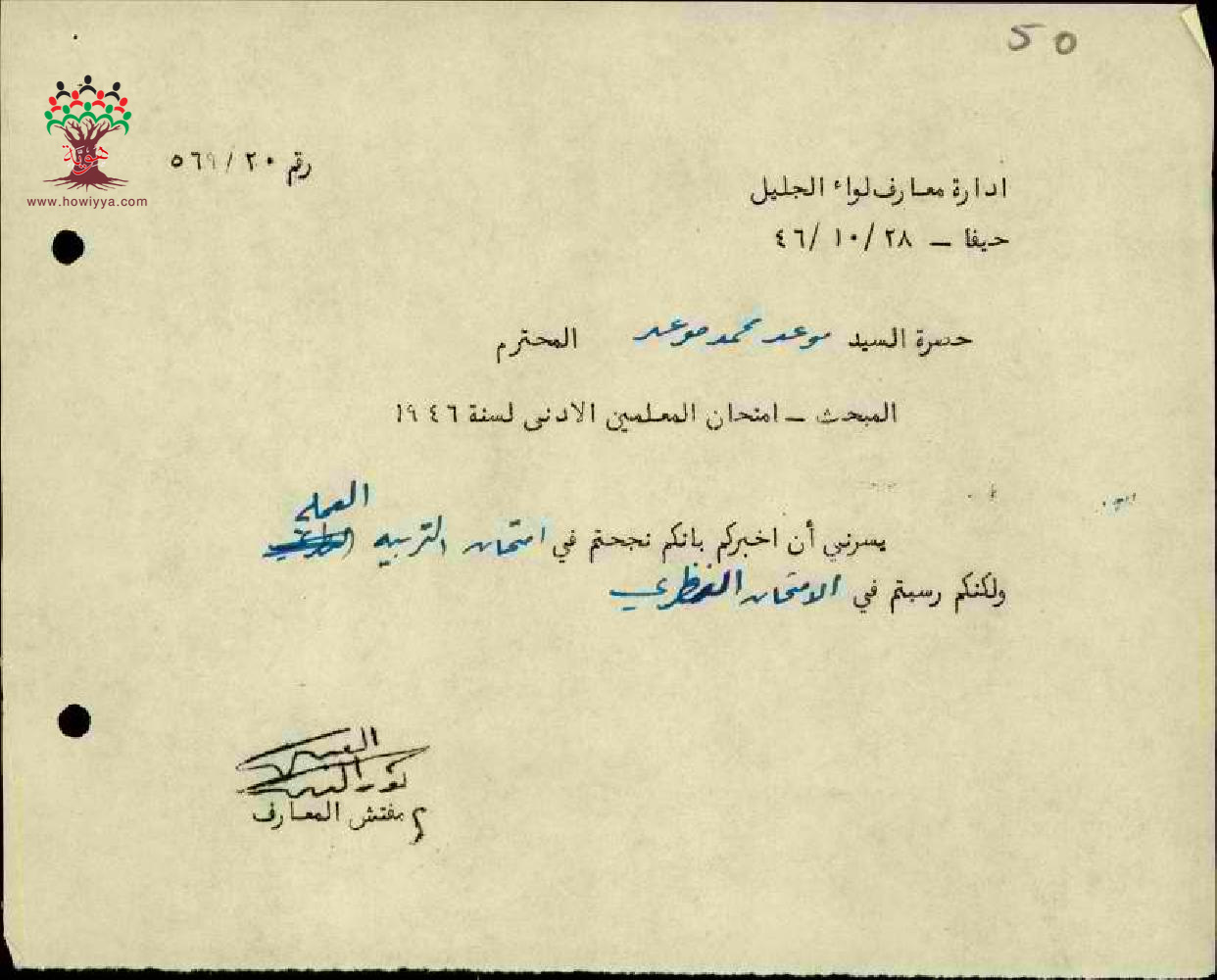 رسالة من مفتش المعارف الى المعلم موعد الموعد يخبره بأنه قد اجتاز امتحان المعلمين الأدنى