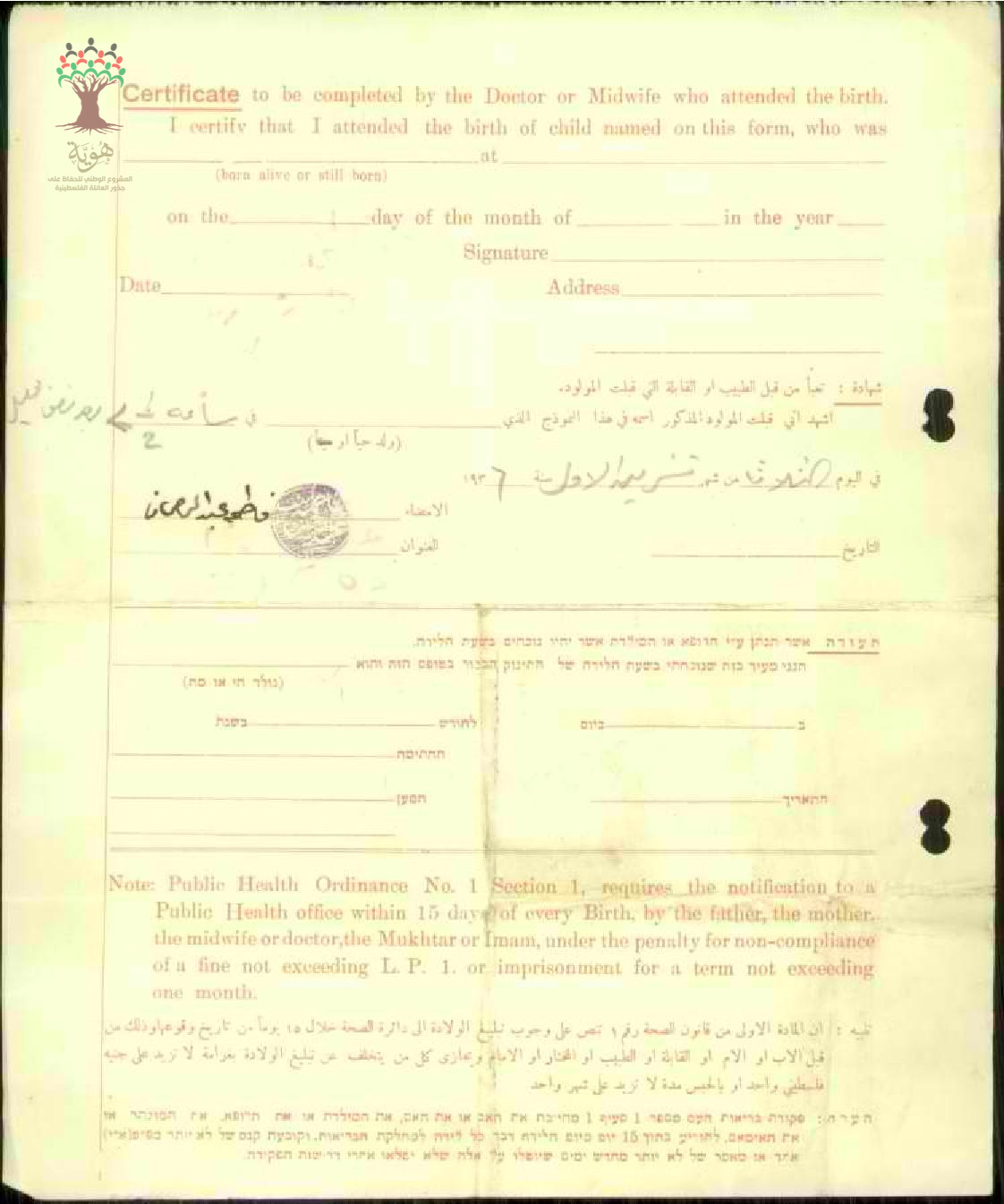 شهادة تبليغ ولادة- مصطفى أنيس مصطفى إبراهيم و أمه فضية محمود
