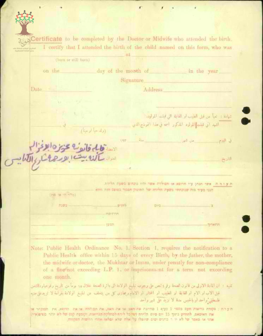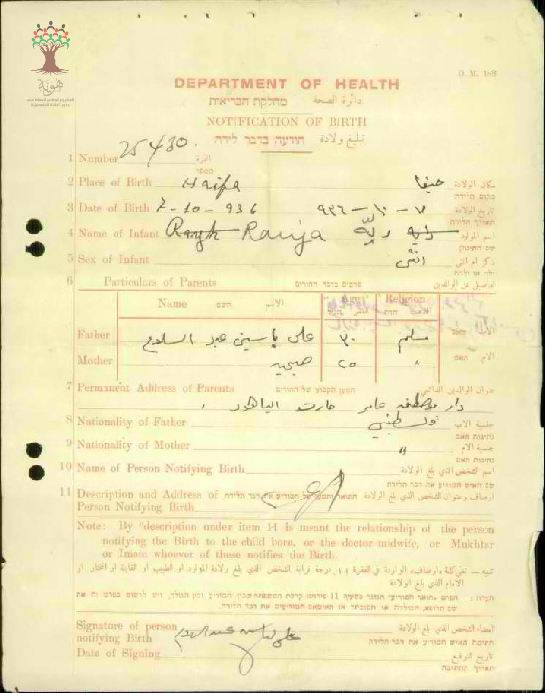 شهادة تبليغ ولادة- ريّة علي ياسين عبد السلام و أمها صبحية