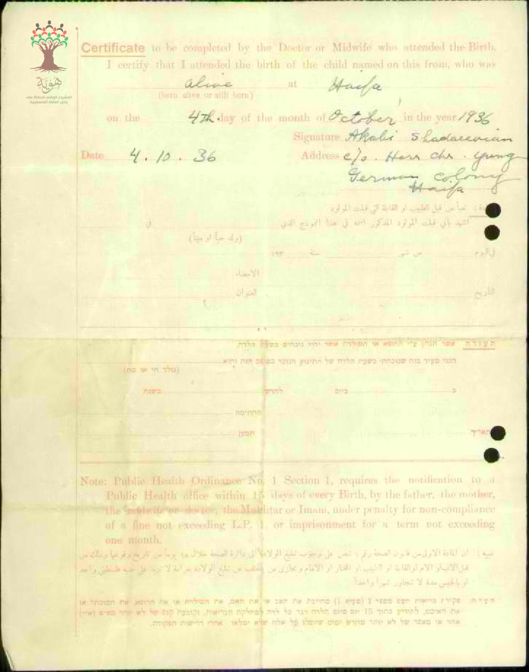 شهادة تبليغ ولادة- حنا يوسف حنا قيس و أمه جليلة يوسف قيس
