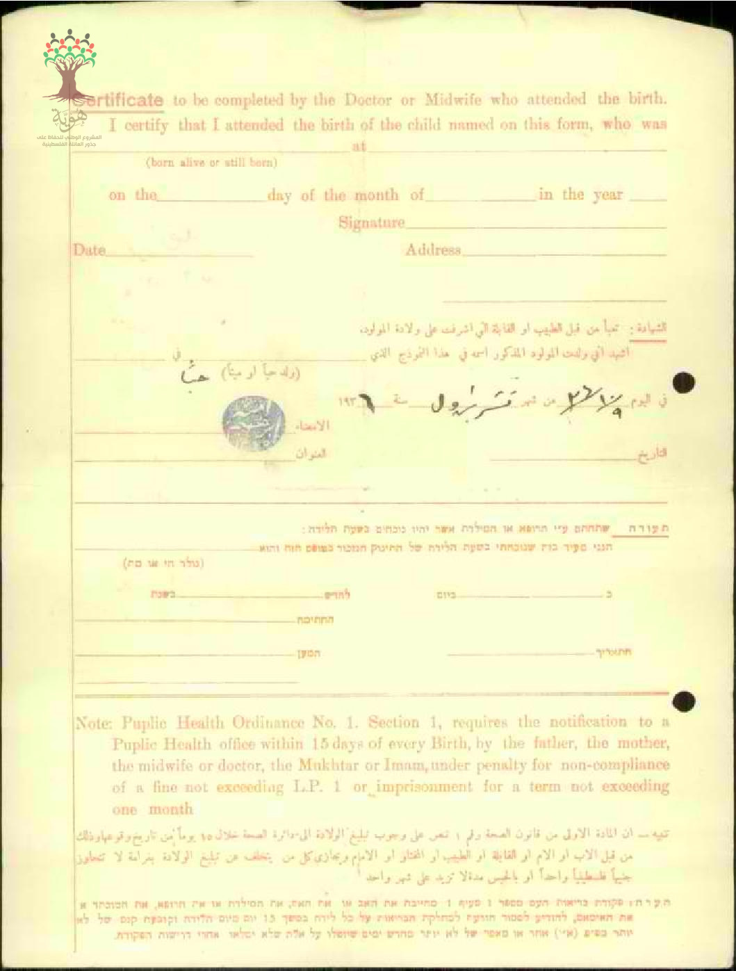 شهادة تبليغ ولادة- فتحية أحمد زعزع و أمها جميلة شعبان المغربي
