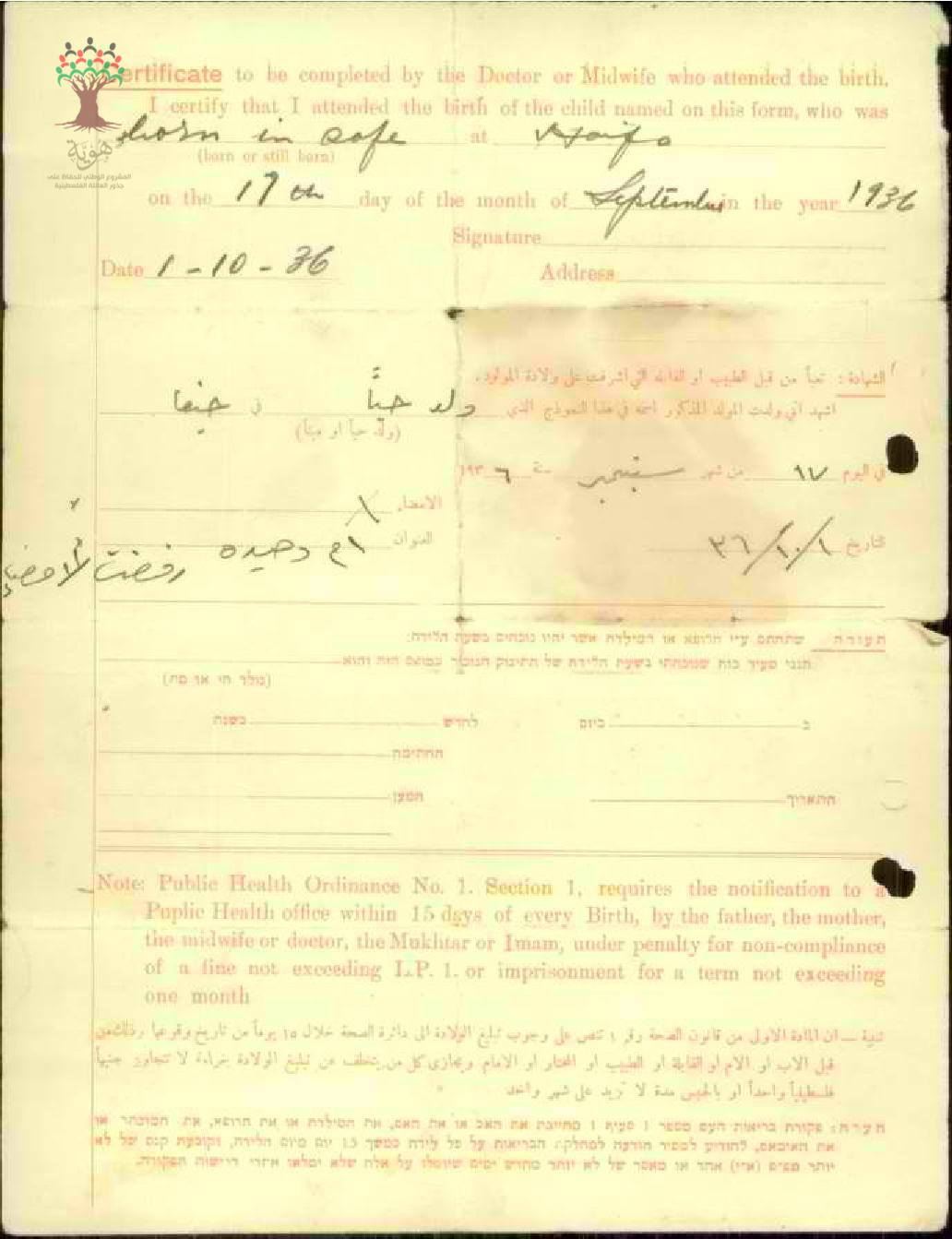 شهادة تبليغ ولادة- شفيقة محمد أمين قدورة و أمها سعاد شقيري
