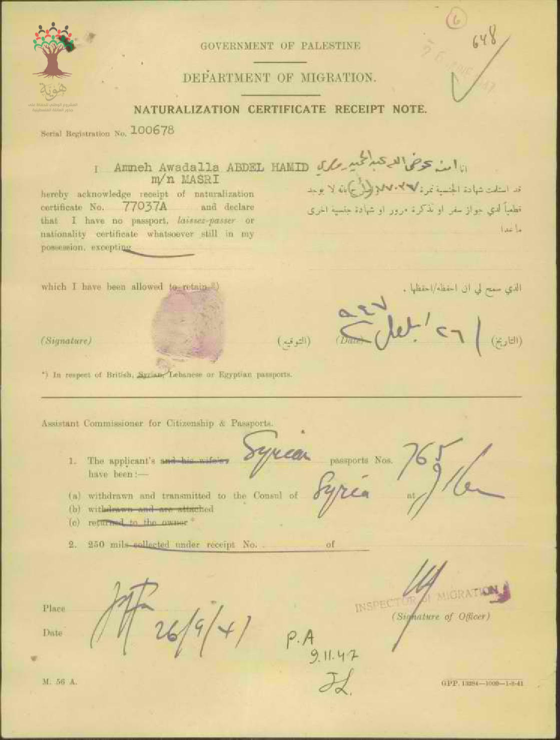ايصال موقع من آمنة عوض الله عبد الحميد (المصري) باستلام شهادة الجنسية الفلسطينيىة