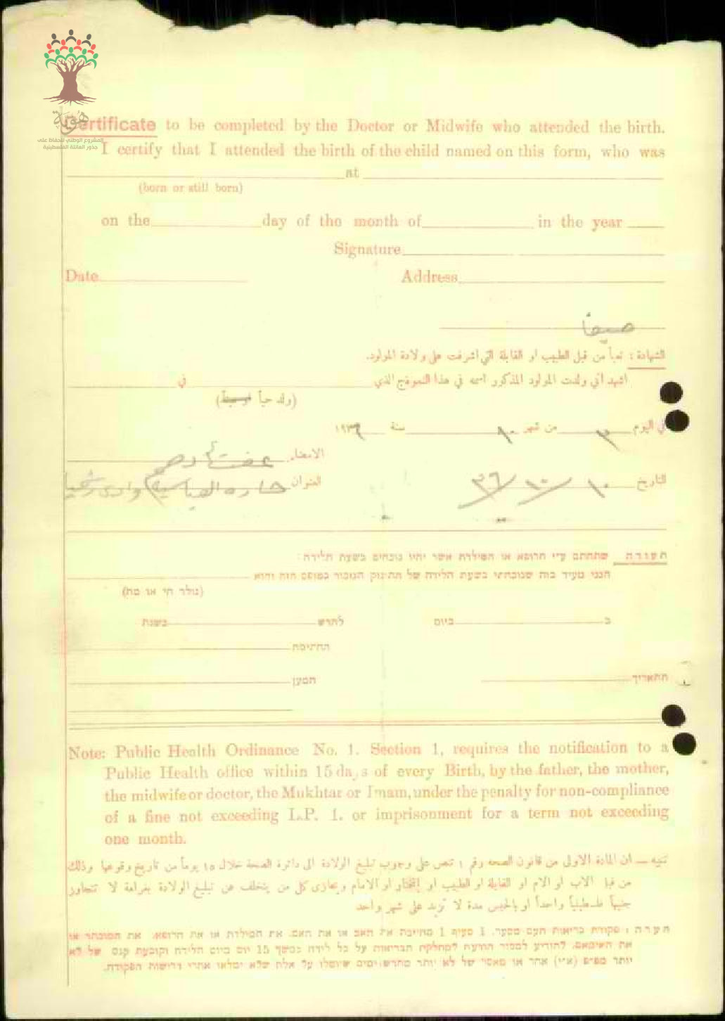 شهادة تبليغ ولادة- فتحية محمود غزال و أمها صالحة محمد الراعي