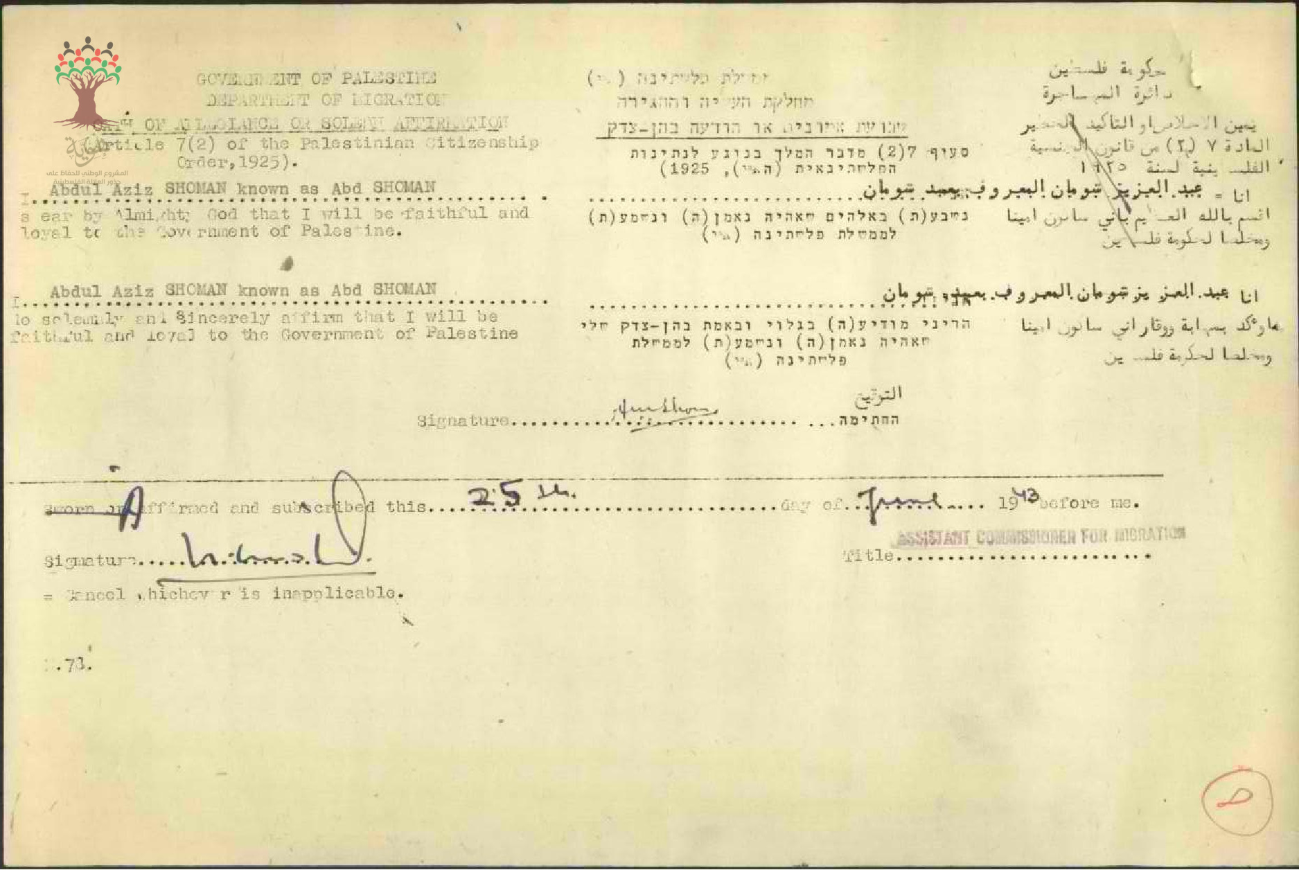 عبد العزيز شومان يوقع على(يمين الاخلاص)للحصول على الجنسية الفلسطيينية