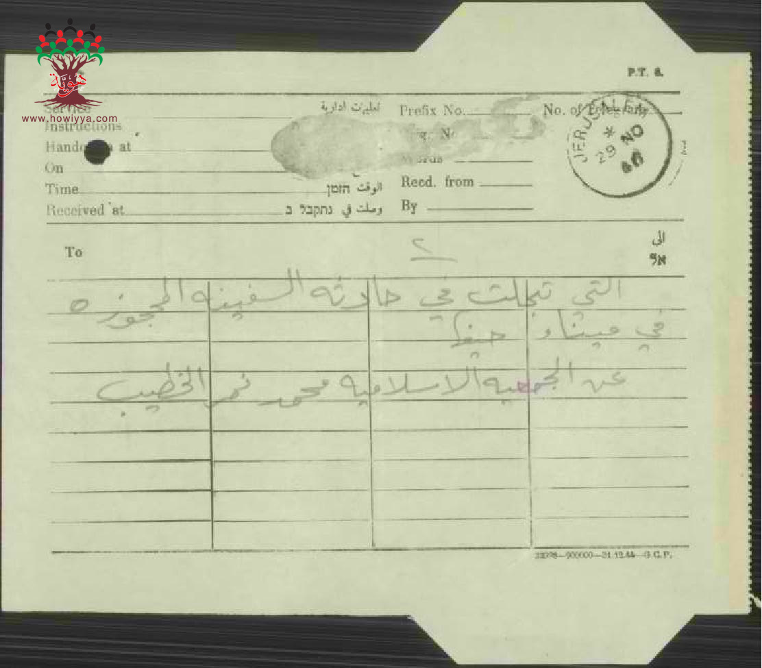 تلغراف مرسل من محمد نمر الخطيب/الجمعية الاسلامية الى المندوب السامي احتجاجا على استمرار الهجرة اليهودية الى فلسطين