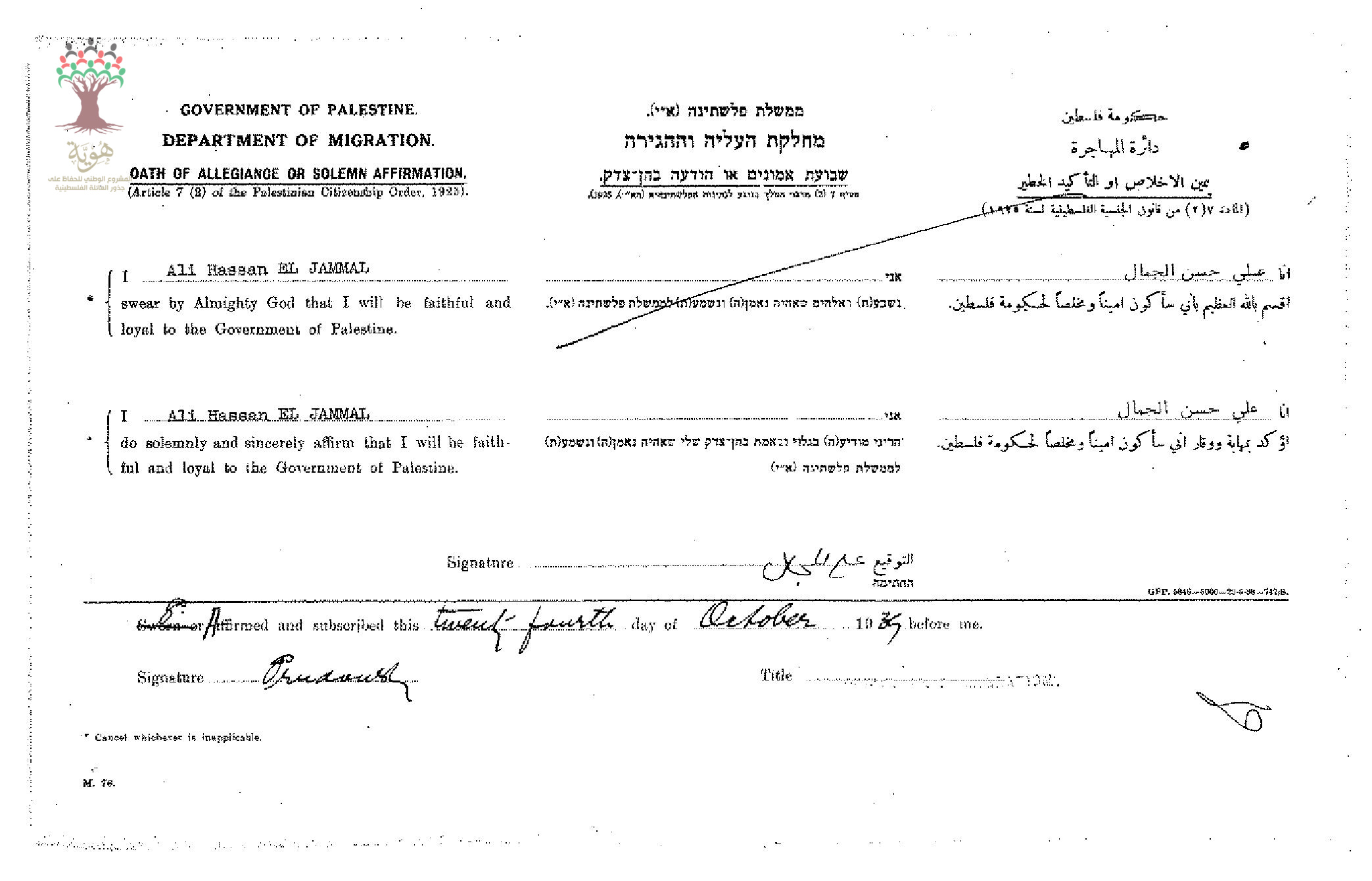 علي حسن الجمال يوقع على(يمين الاخلاص)للحصول على الجنسية الفلسطينية