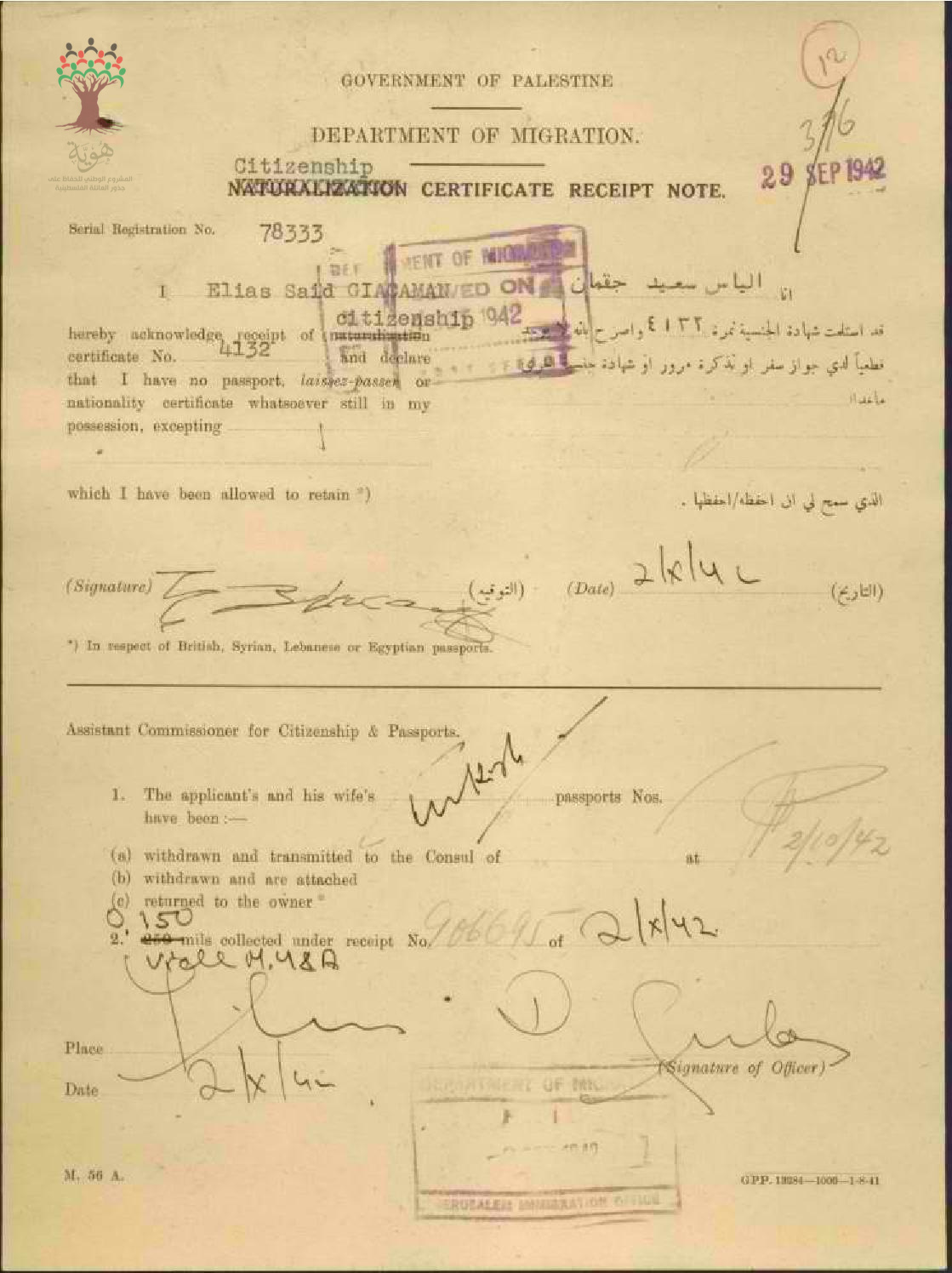 إيصال موقع من إلياس سعيد جقمان باستلام شهادة الجنسية الفلسطينية