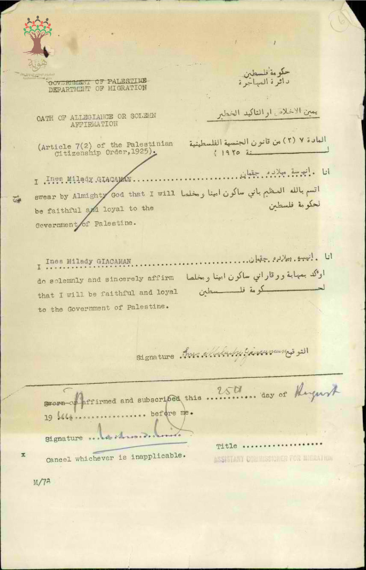 أنيسة جقمان توقع على (يمين الاخلاص) للحصول على الجنسية الفلسطينية