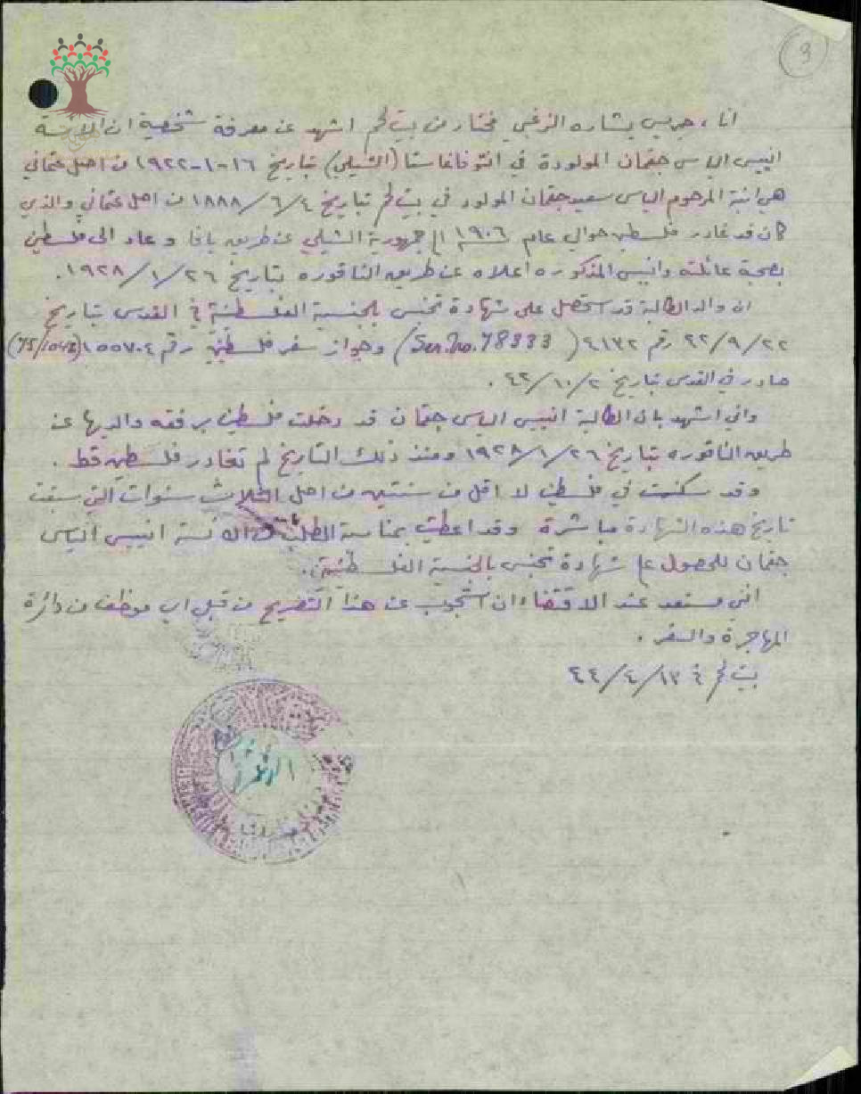 شهادة من المختار جريس بشارة الزغبي للسيدة أنيسة إلياس جقمان بخصوص طلب الجنسية/بيت جالا