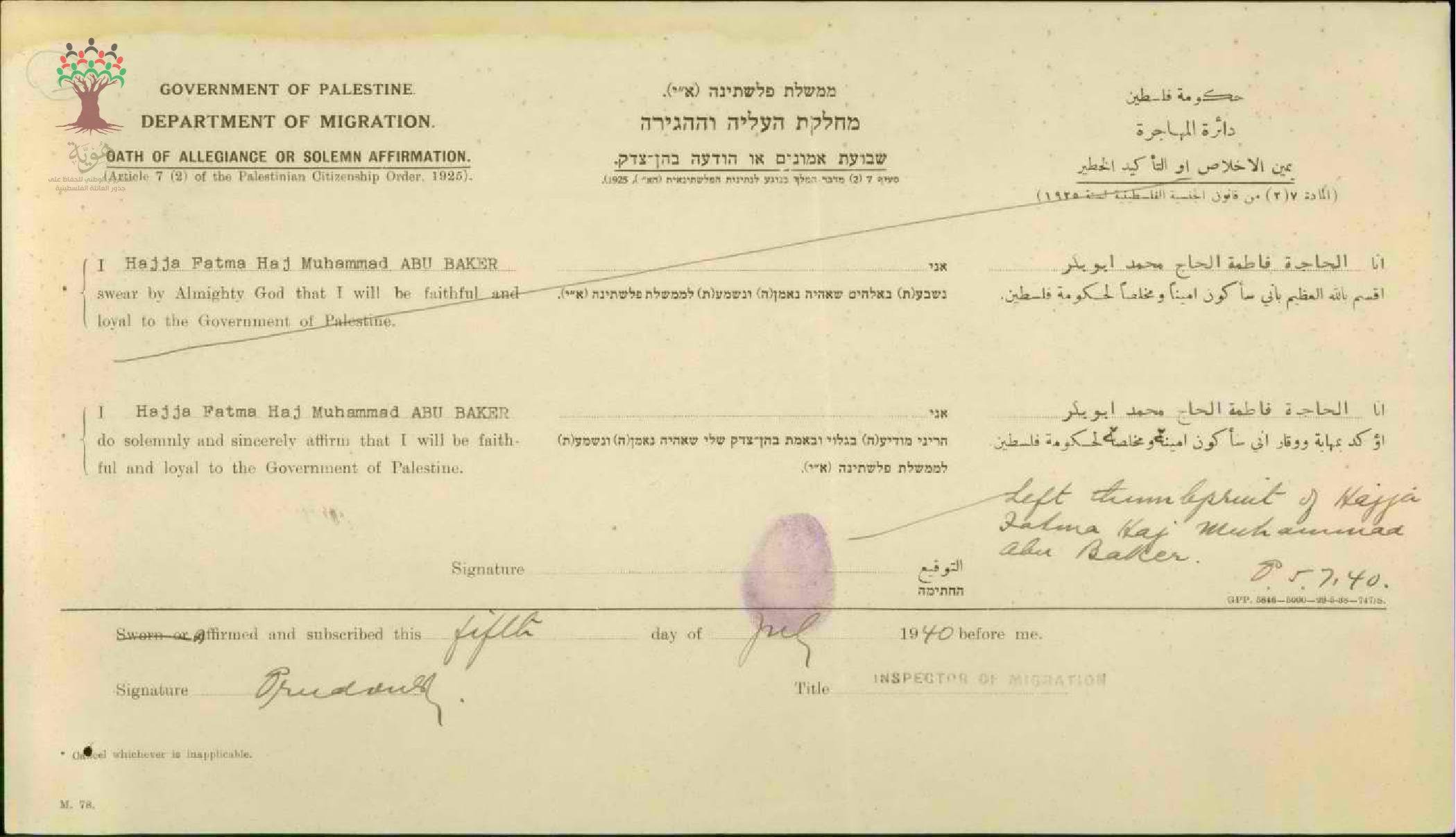 فاطمة الحاج محمد أبو بكر(الاطرش) توقع على(يمين الاخلاص) للحصول على الجنسية الفلسطينية