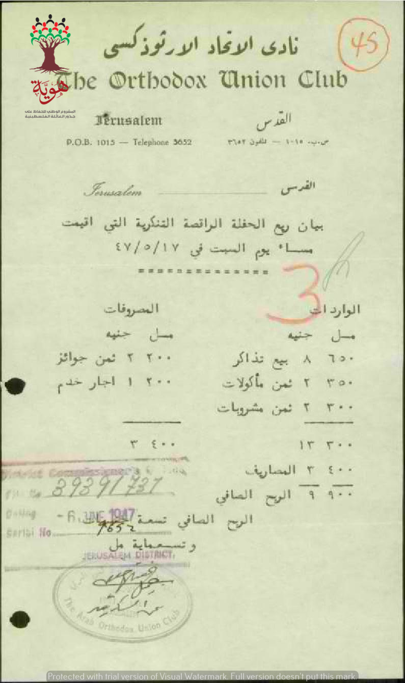 بيان ريع الحفلة التنكرية الخيرية التي أقامها نادي الإتحاد الأرثوذكسي