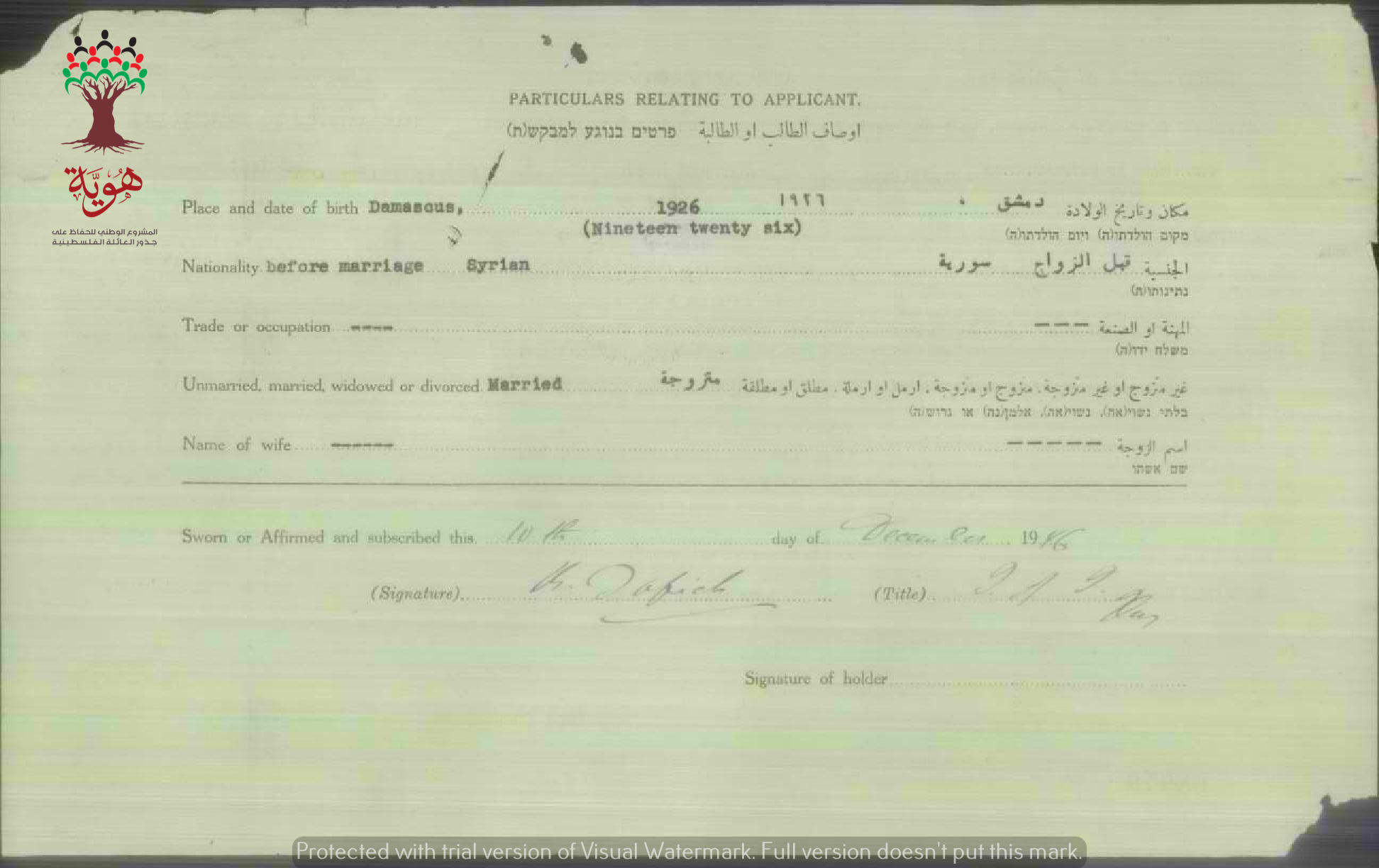 شهادة الجنسية الفلسطينية ل بشرى جعارة زغلول