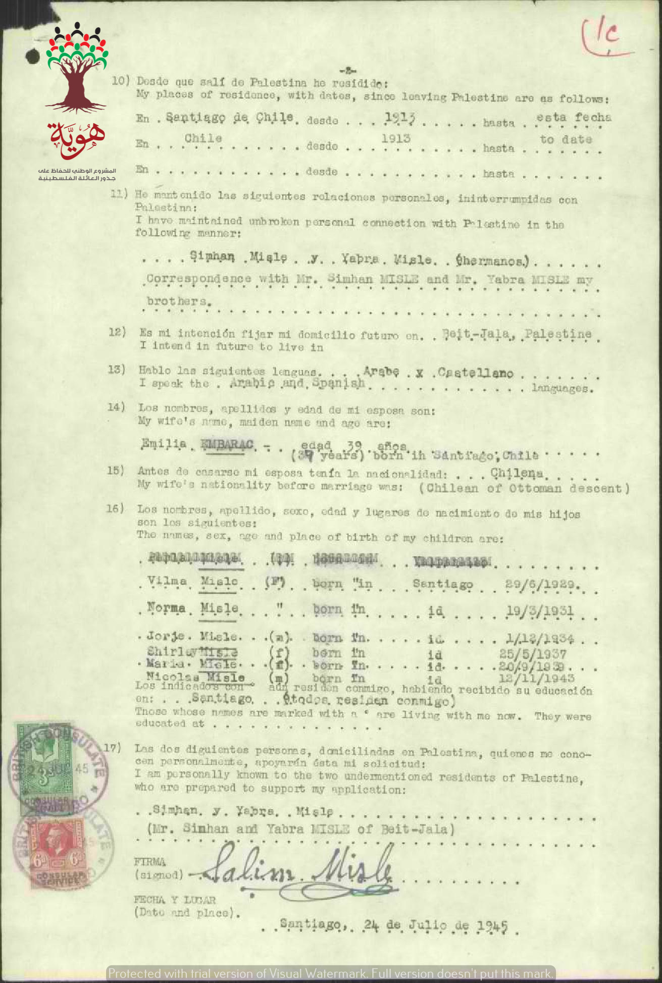 طلب شهادة الجنسية الفلسطينية-سليم مصلح-بيت جالا/تشيلي