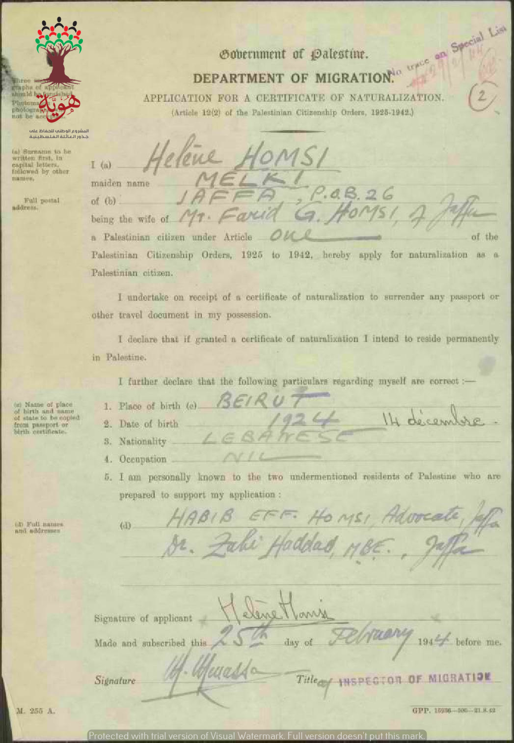 طلب شهادة الجنسية الفلسطينية-هيلين الحمصي ملكي-يافا/لبنان