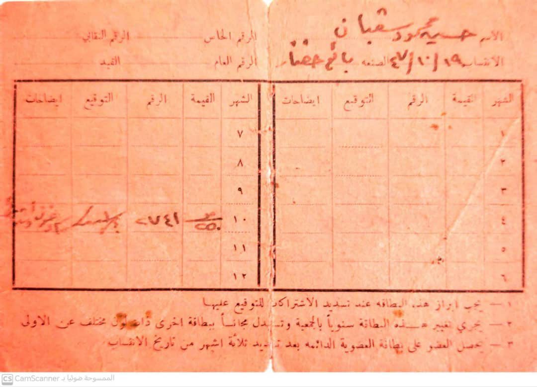 بطاقة عضوية في جمعية العمال العربية الفلسطينية- حسين محمود شعان / حطين .. تاريخ الانتساب 19/10/1947 بصفته بائع خضار.
