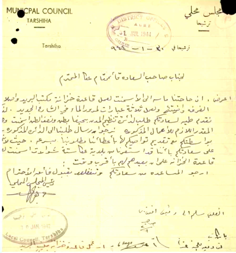 تقدم المجلس المحلي في ترشيحا، بتاريخ 30 كانون الثاني 1944، بكتاب الى قائمقام عكا للحصول على كمية من الاسمنت لاجراء اصلاحات في مكتب البريد، وبناء عبارات في الشارع الجديد. الوثيقة تحمل توقيع رئيس المجلس المحلي في ذلك الوقت المرحوم تقي الدين احمد آغا.