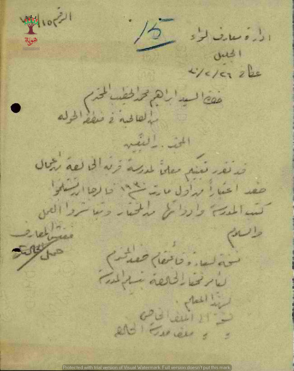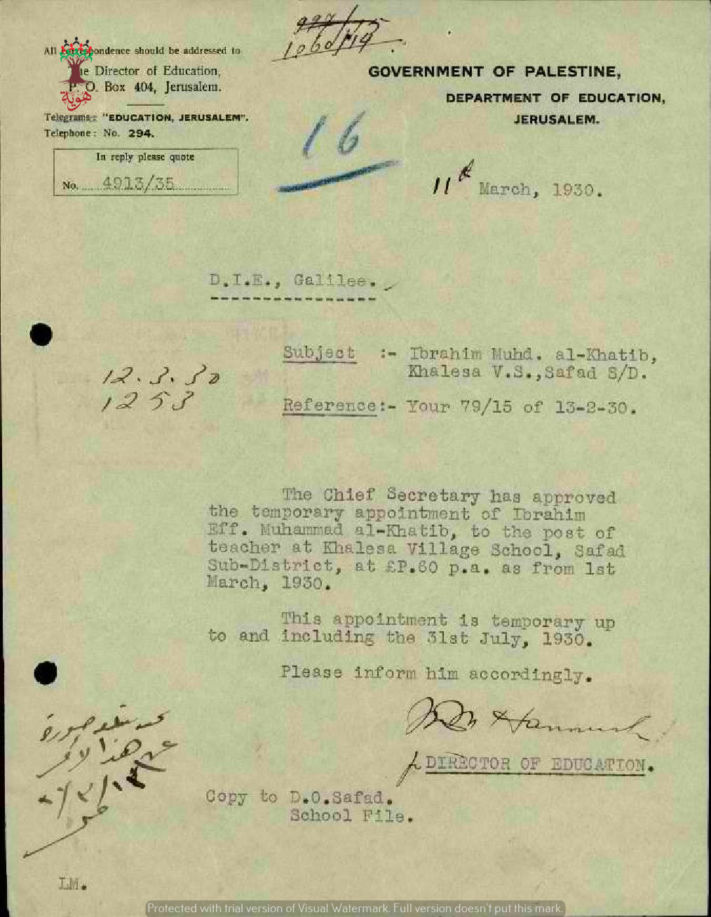 مجموعة رسائل بخصوص تعيين المعلم ابراهيم محمد الخطيب في مدرسة الخالصة