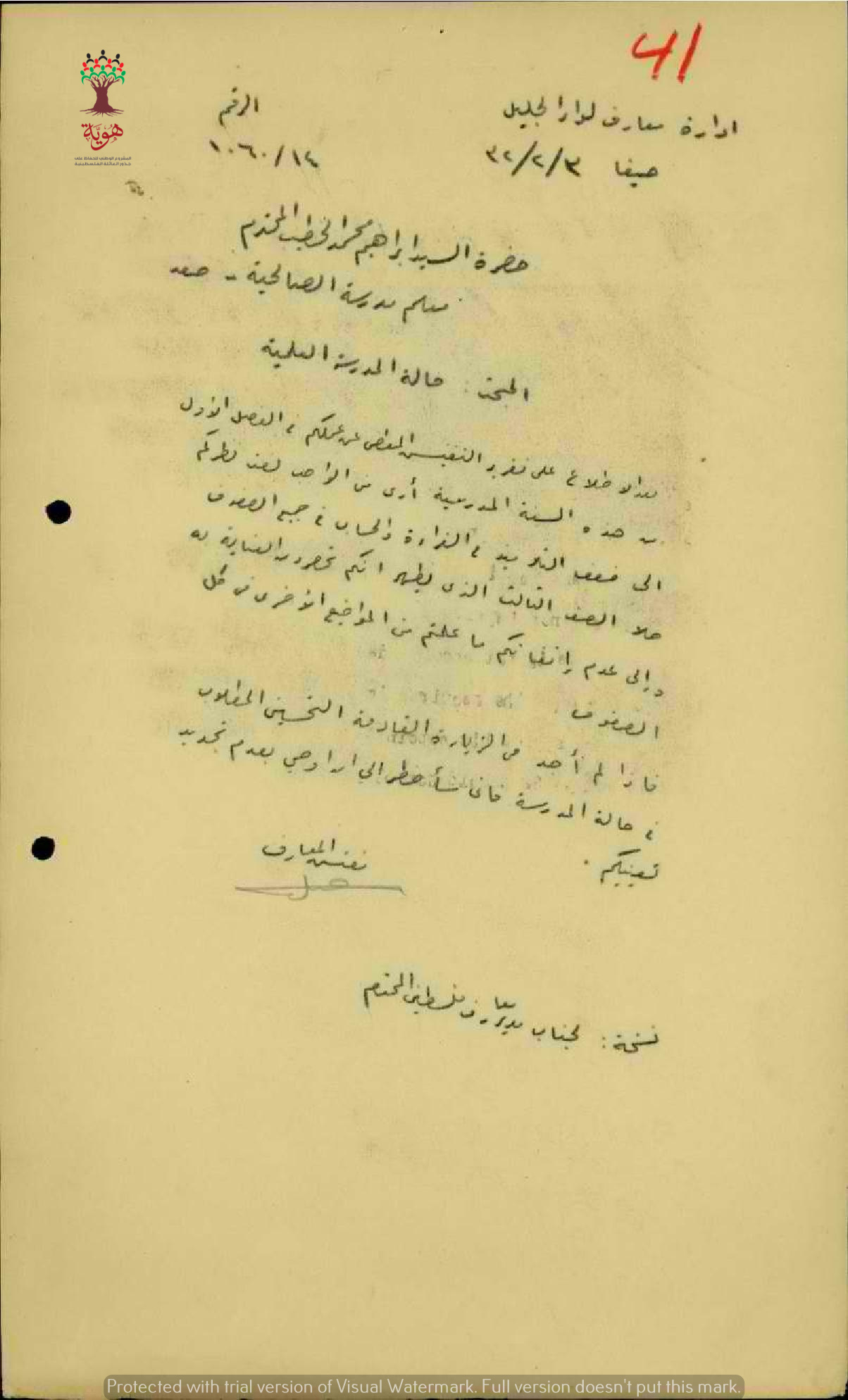 رسالة من مفتش المعارف الى المعلم ابراهيم الخطيب بخصوص الحالة العلمية للمدرسة
