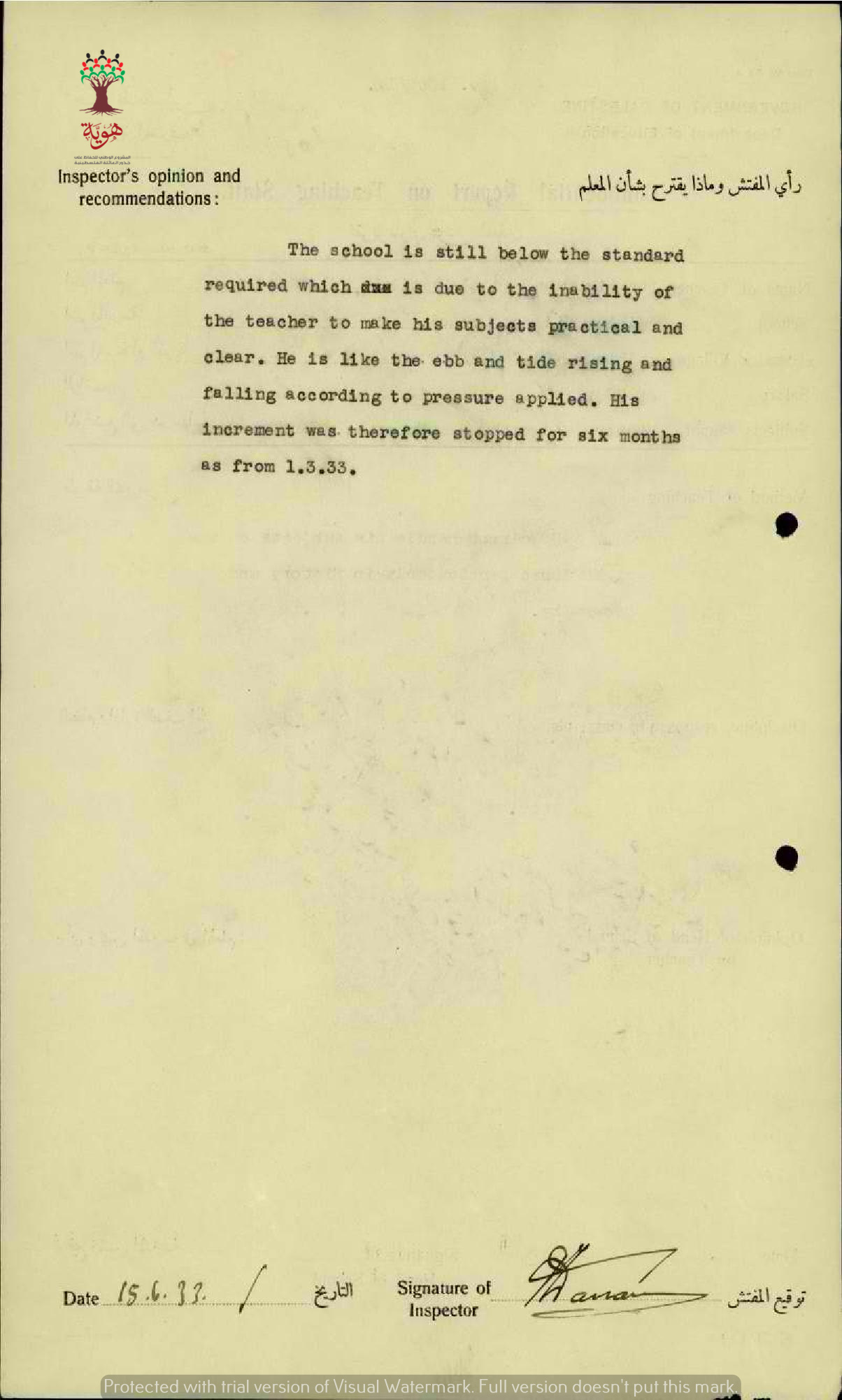 تقرير تفصيلي عن أداء المعلم ابراهيم محمد الخطيب في مدرسة الصالحية سنة 1933