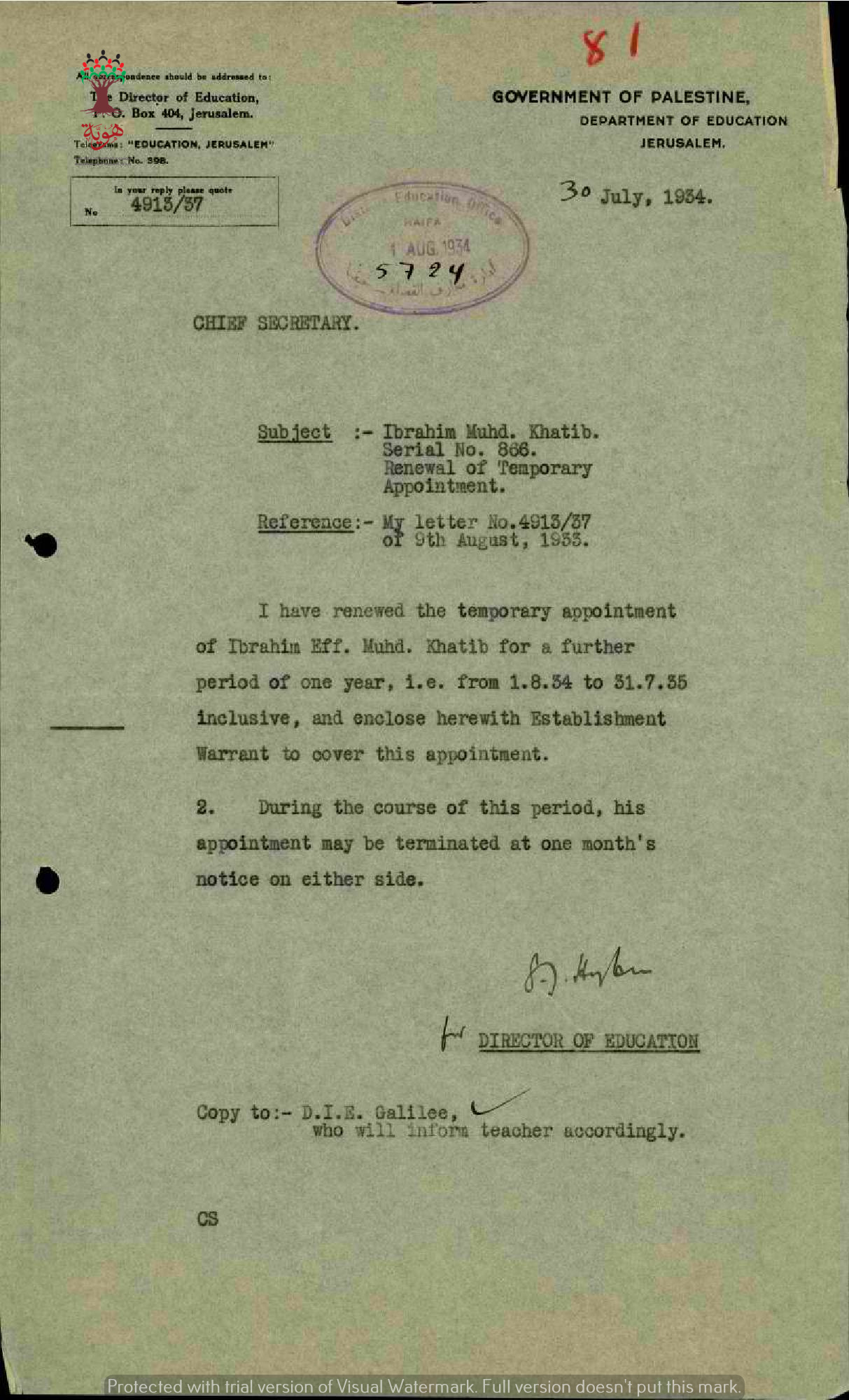 رسائل بخصوص تجديد تعيين المعلم ابراهيم الخطيب في مدرسة الصالحية لمدة سنة