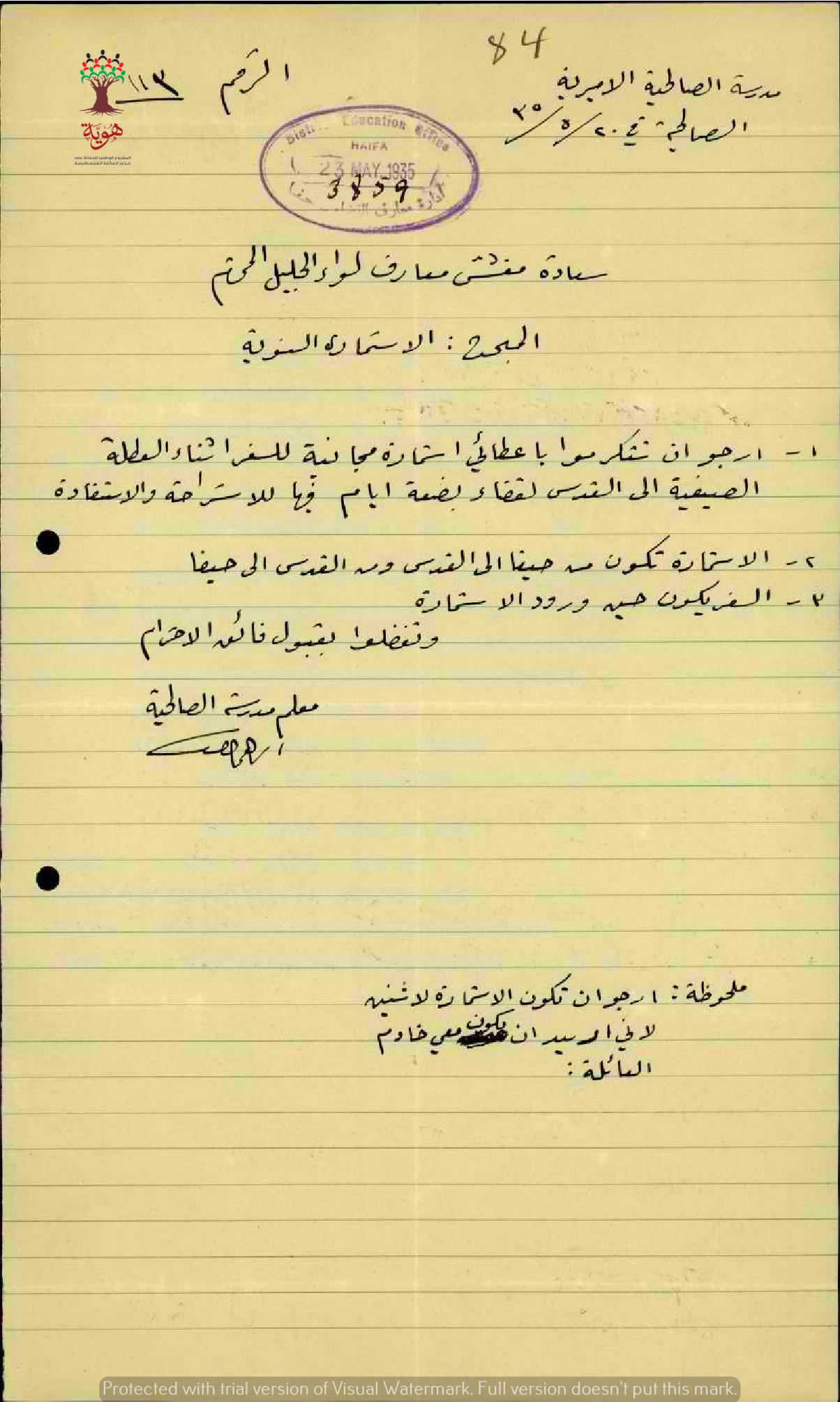رسالة من المعلم ابراهيم الخطيب الى مفتش المعارف يطلب فيها استمارة سفره السنوية