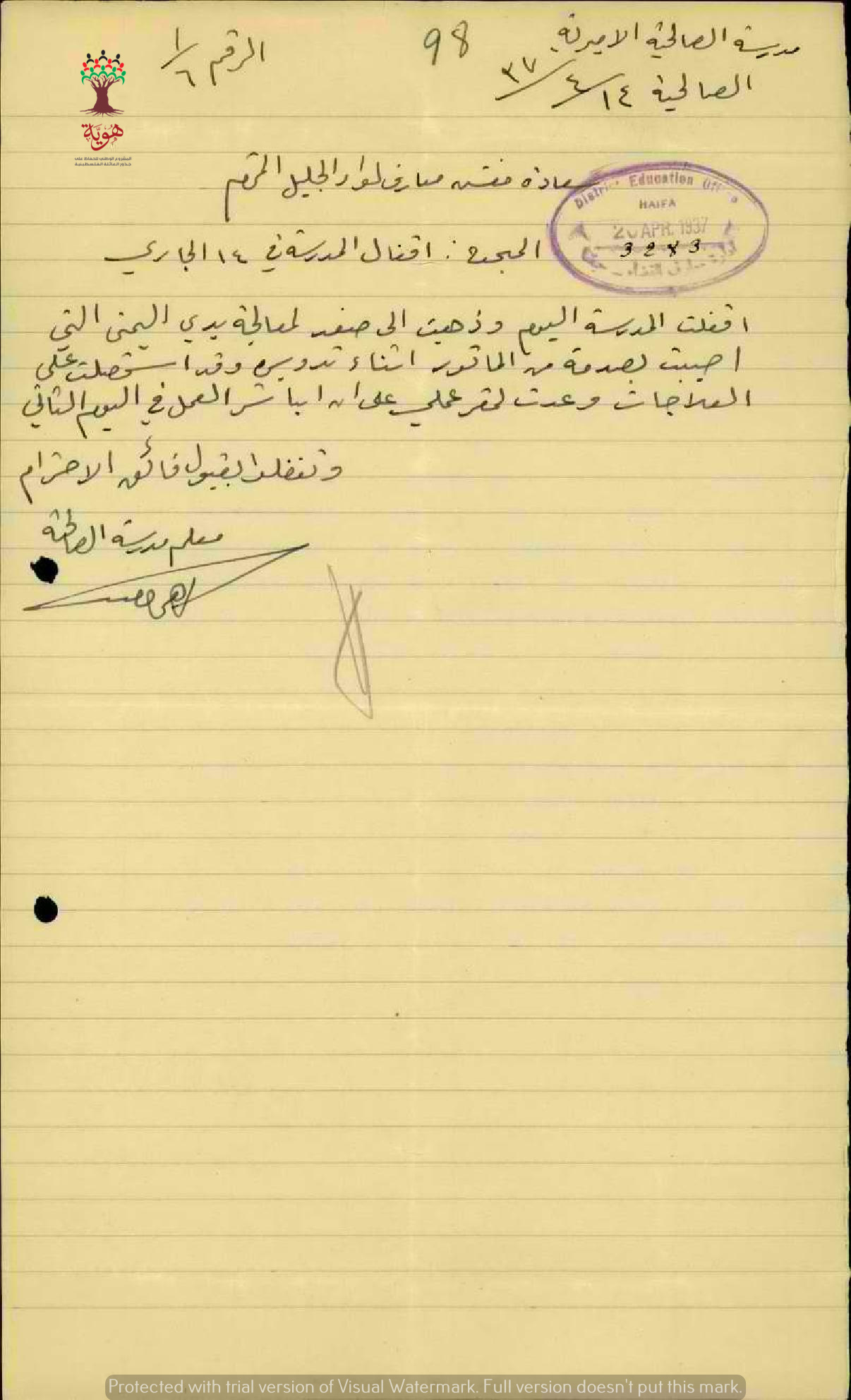 رسالة من المعلم ابراهيم الخطيب الى مفتش المعارف بخصوص تغيبه عن المدرسة لمعالجة يده