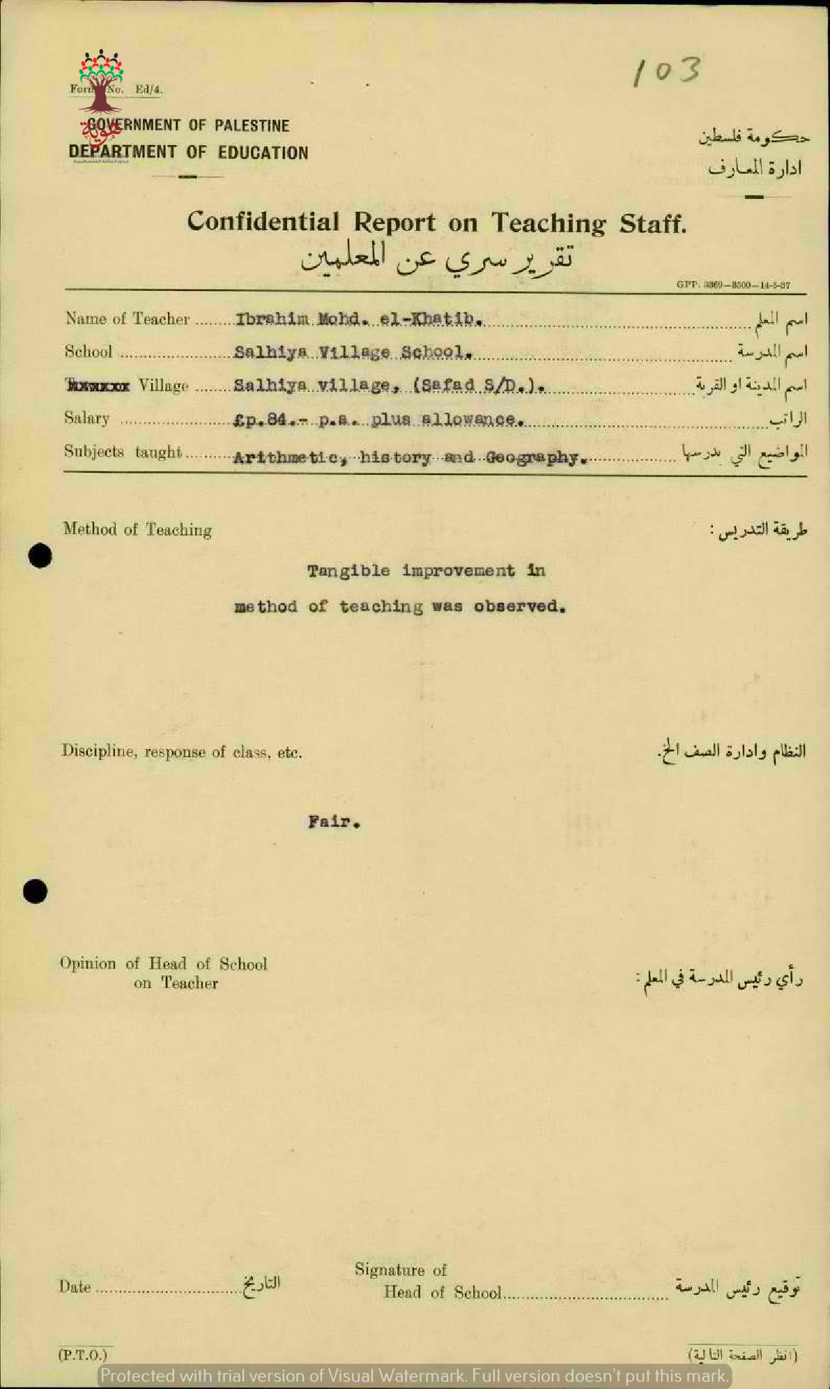 تقرير تفصيلي عن أداء المعلم ابراهيم محمد الخطيب في مدرسة الصالحية سنة 1937