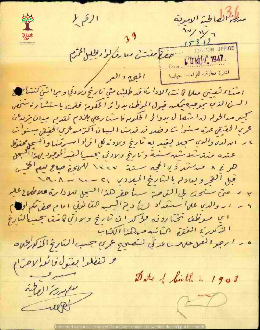 رسالة من المعلم ابراهيم الخطيب الى مفتش المعارف بخصوص تصحيح عمره وارسال سجل ميلاده فور الحصول عليه