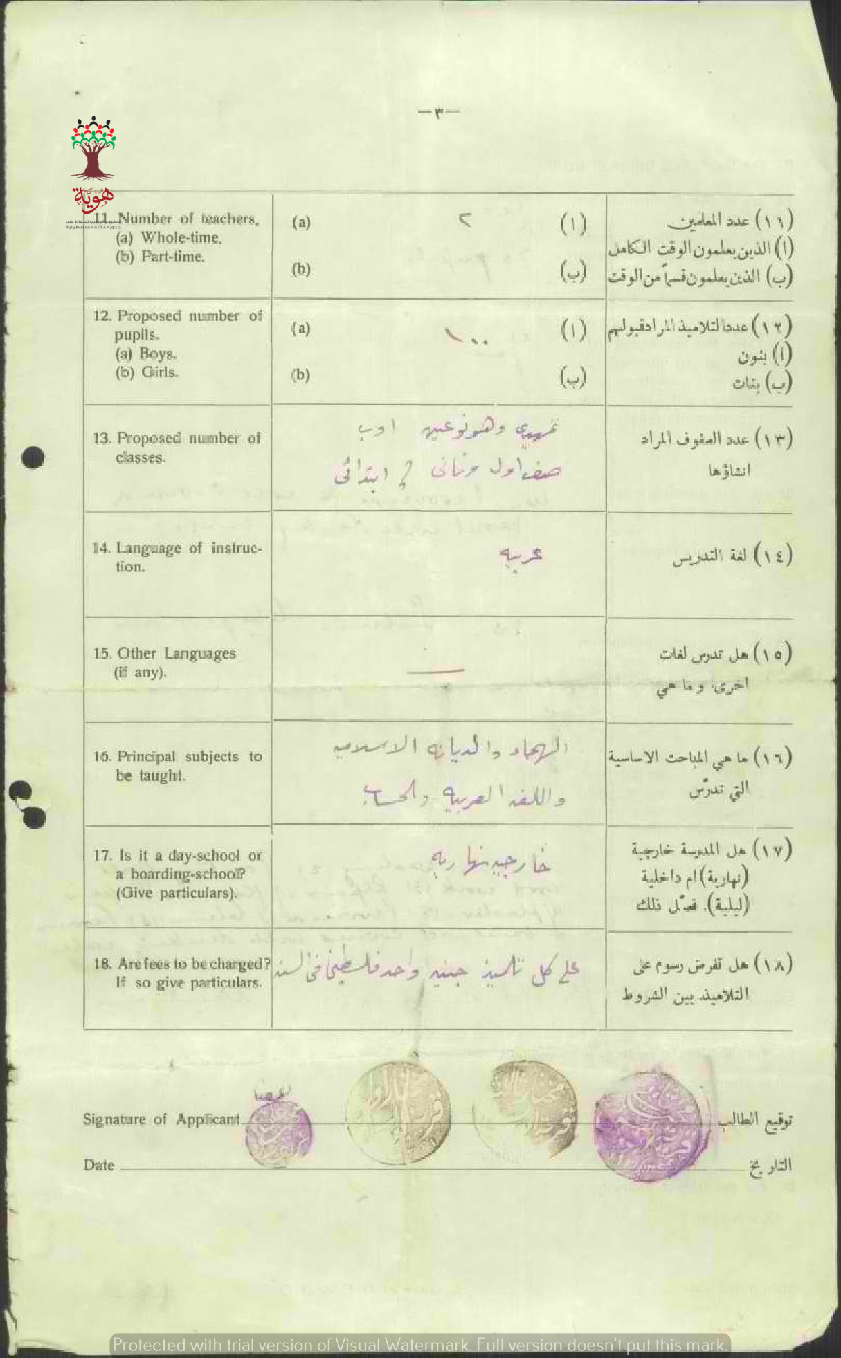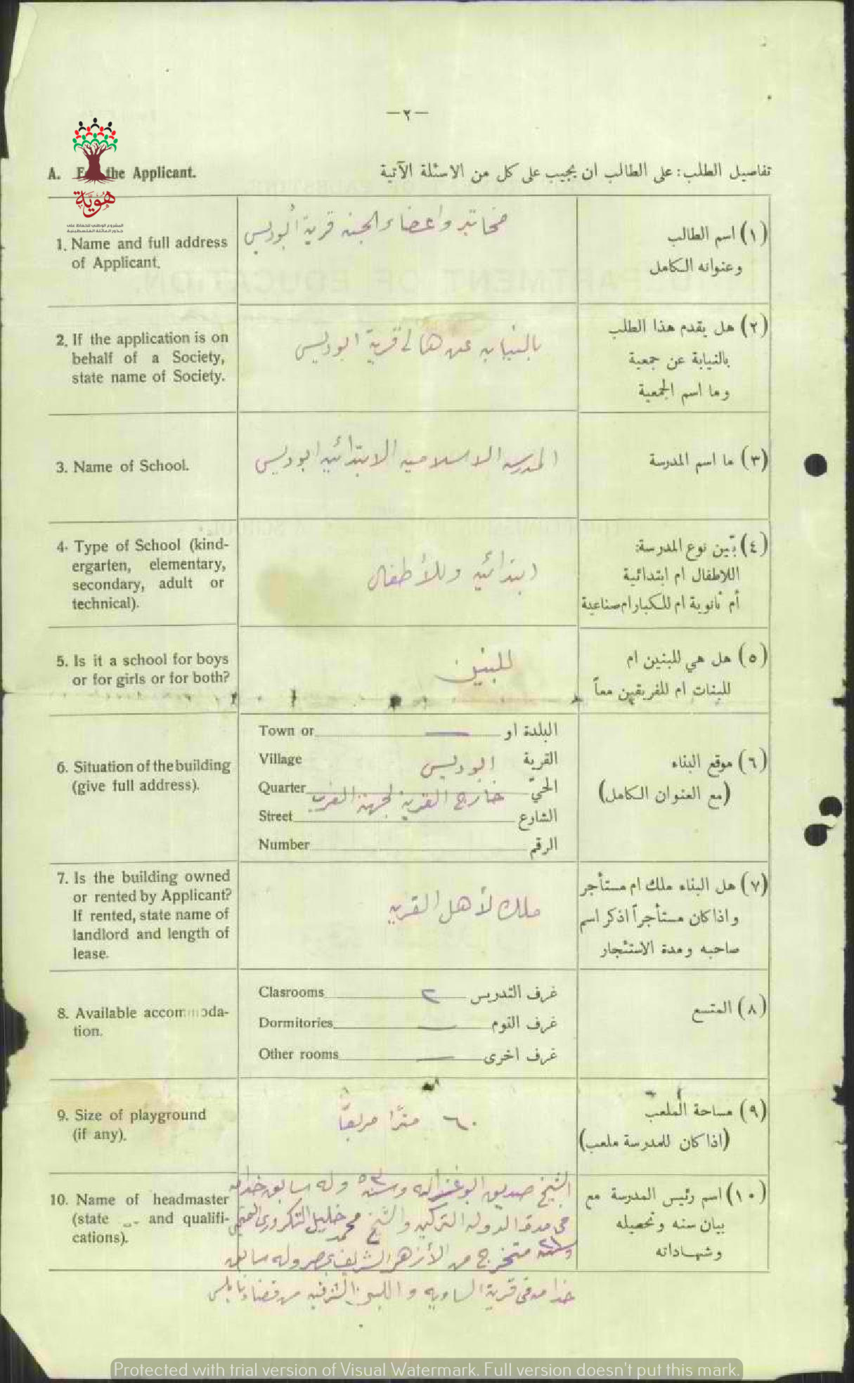 ورقة استئذان بتسجيل وفتح مدرسة في بلدة أبو ديس