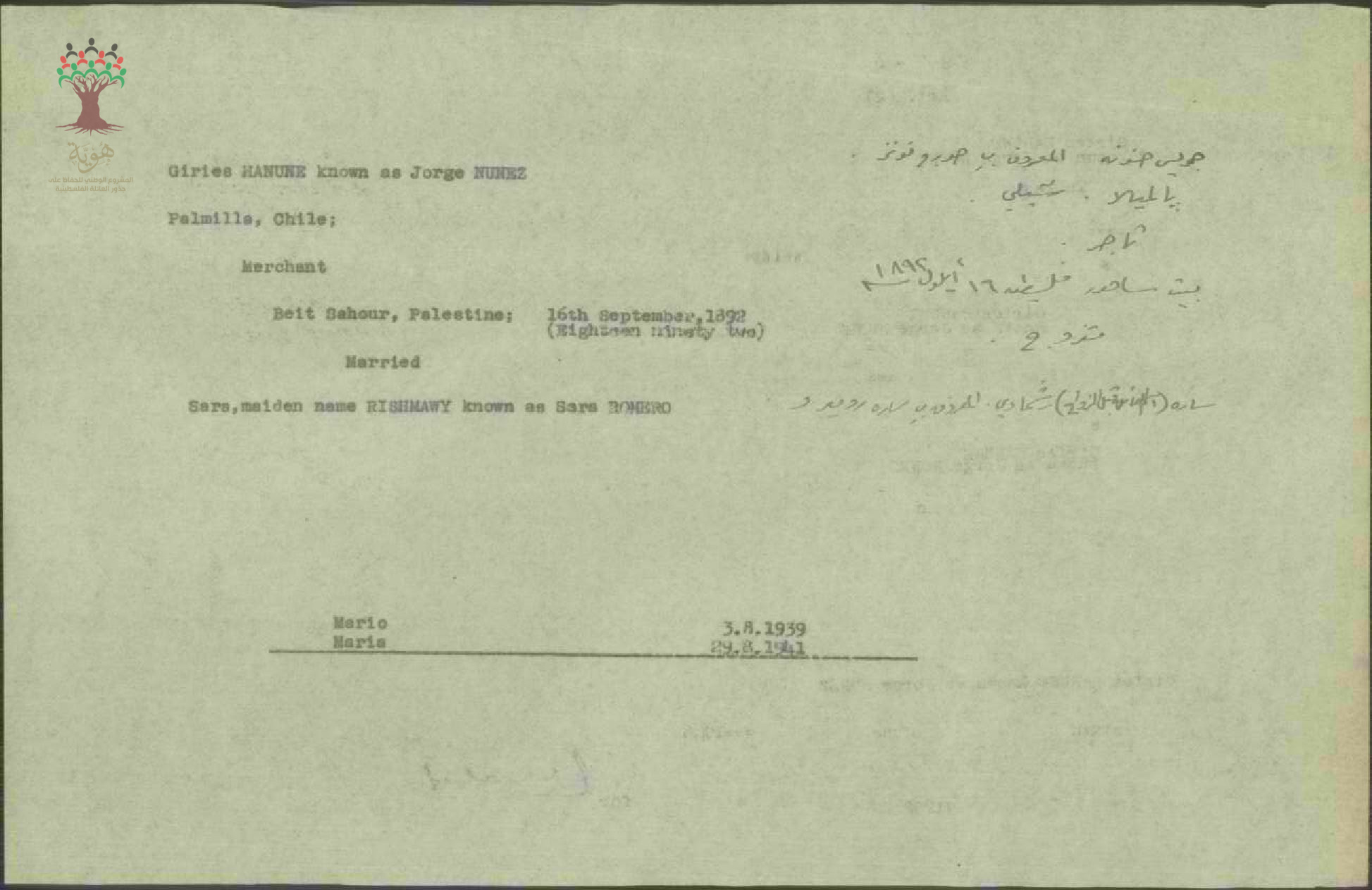 ورقة بيانات جريس حنونة المرفقة بطلب الجنسية وزوجته سارة رشماوي