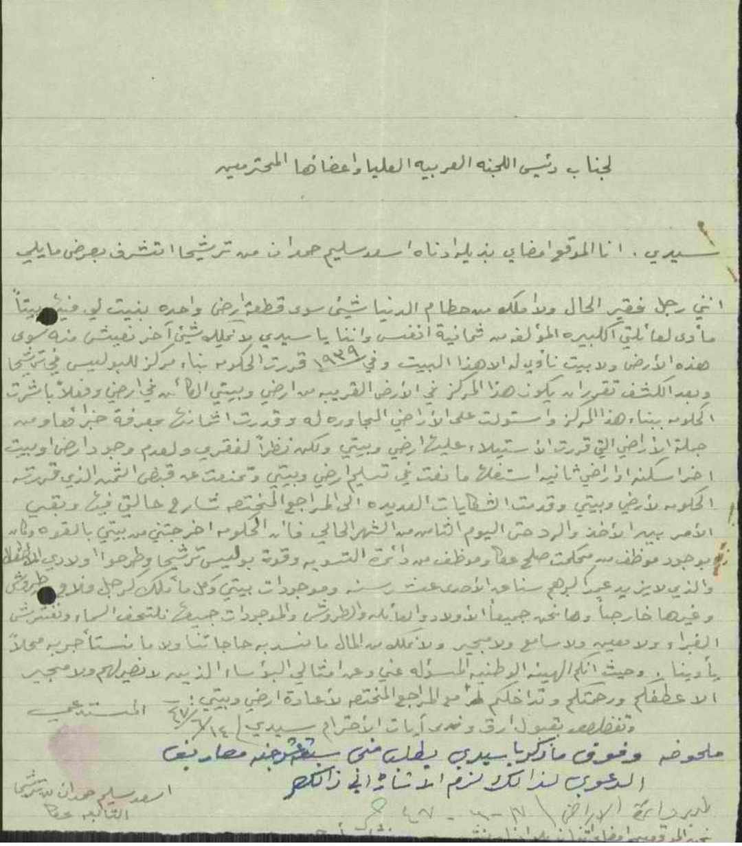 رسالة من أسعد سليم حمدان الى رئيس اللجنة العربية العليا بخصوص الاستيلاء على بعض الاراضي المجاورة له ومن ضمنها ارضه وبيته لبناء مركز للبوليس في ترشيحا وتم تقدير ثمنها من خبرائهم