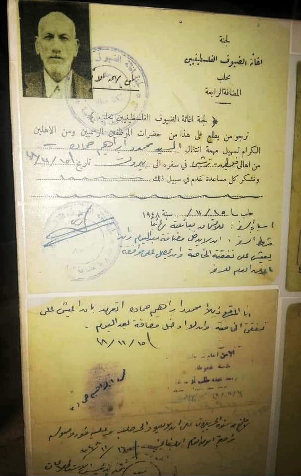 ورقة من لجنة اغاثة الضيوف الفلسطينيين في حلب لتسهيل نقل محمود ابراهيم حمادي من حلب الى بيروت وهو من قرية ترشيحا الفلسطينية
