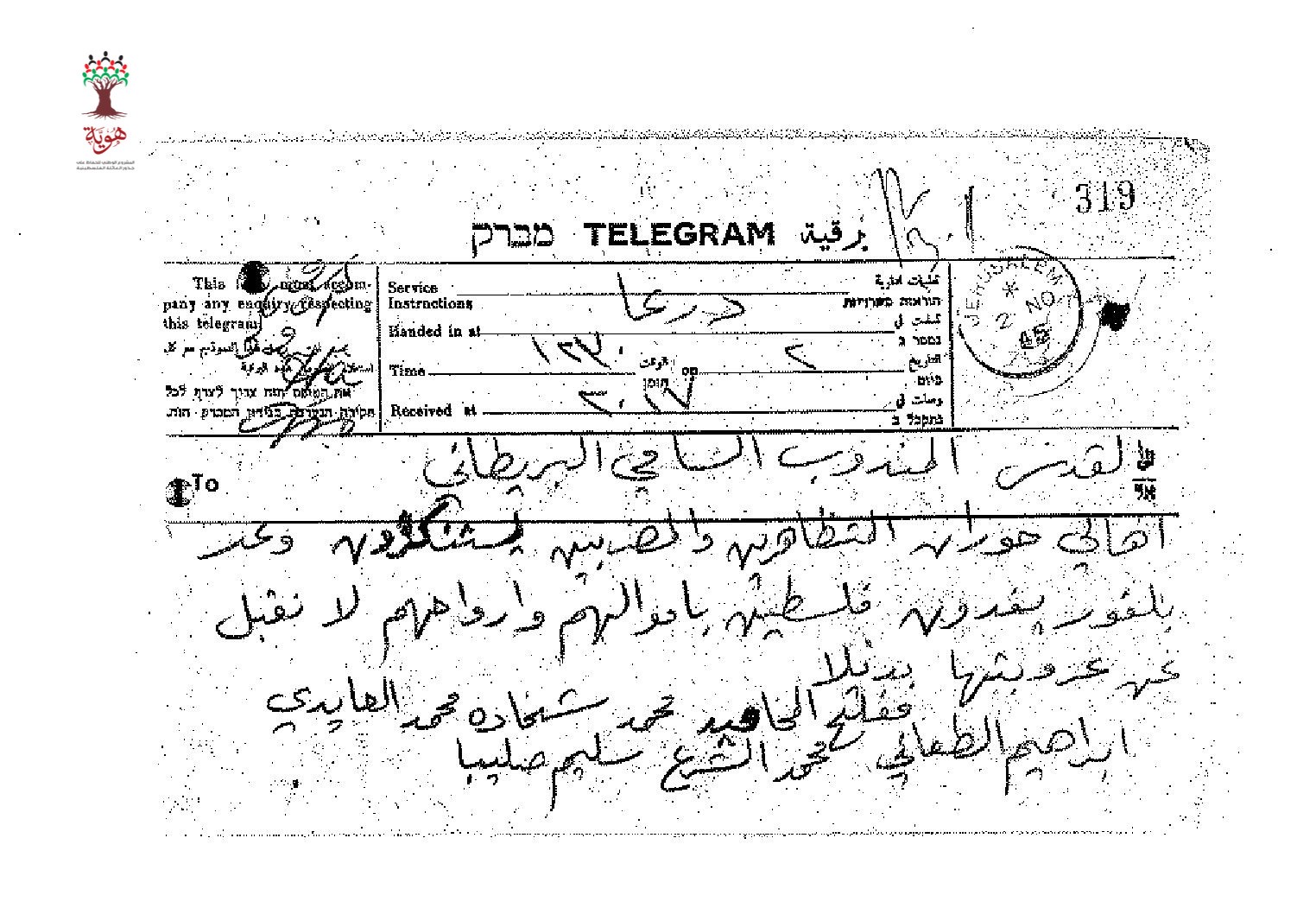 برقية مرسلة من اهالي حوران/درعا الى المندوب السامي احتجاجا على وعد بلفور معلنين الإضراب وانهم مستعدين للتضحية بأرواحهم لأجل فلسطين.