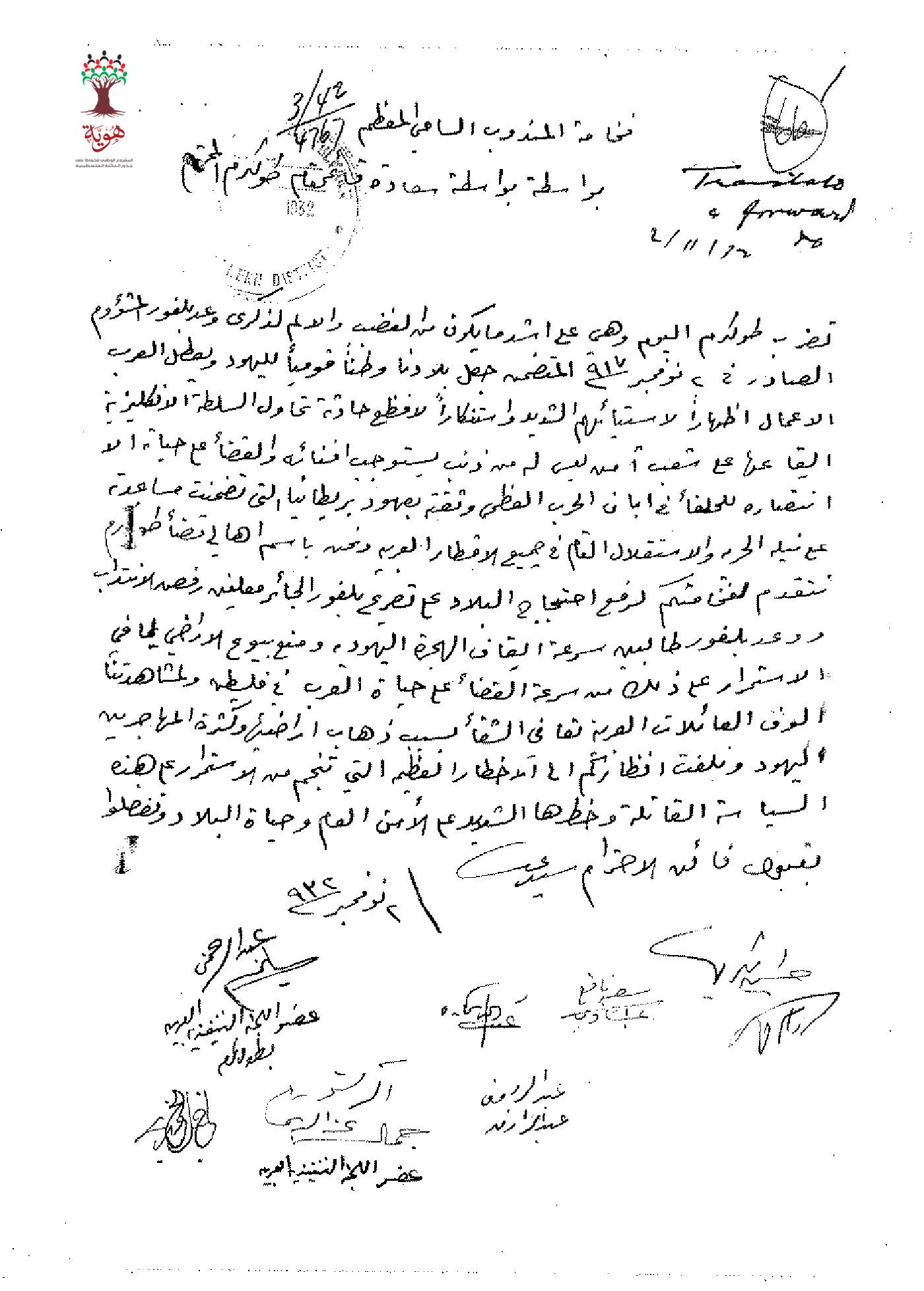 رسالة من أهالي طولكرم الى المندوب السامي احتجاجا على وعد بلفور معلنين الإضراب وغضبهم على هذا الوعد المشؤوم الذي يستولي على حياة العرب في فلسطين ومطالبين بمنع هجرة اليهود وبيع الأراضي لهم.