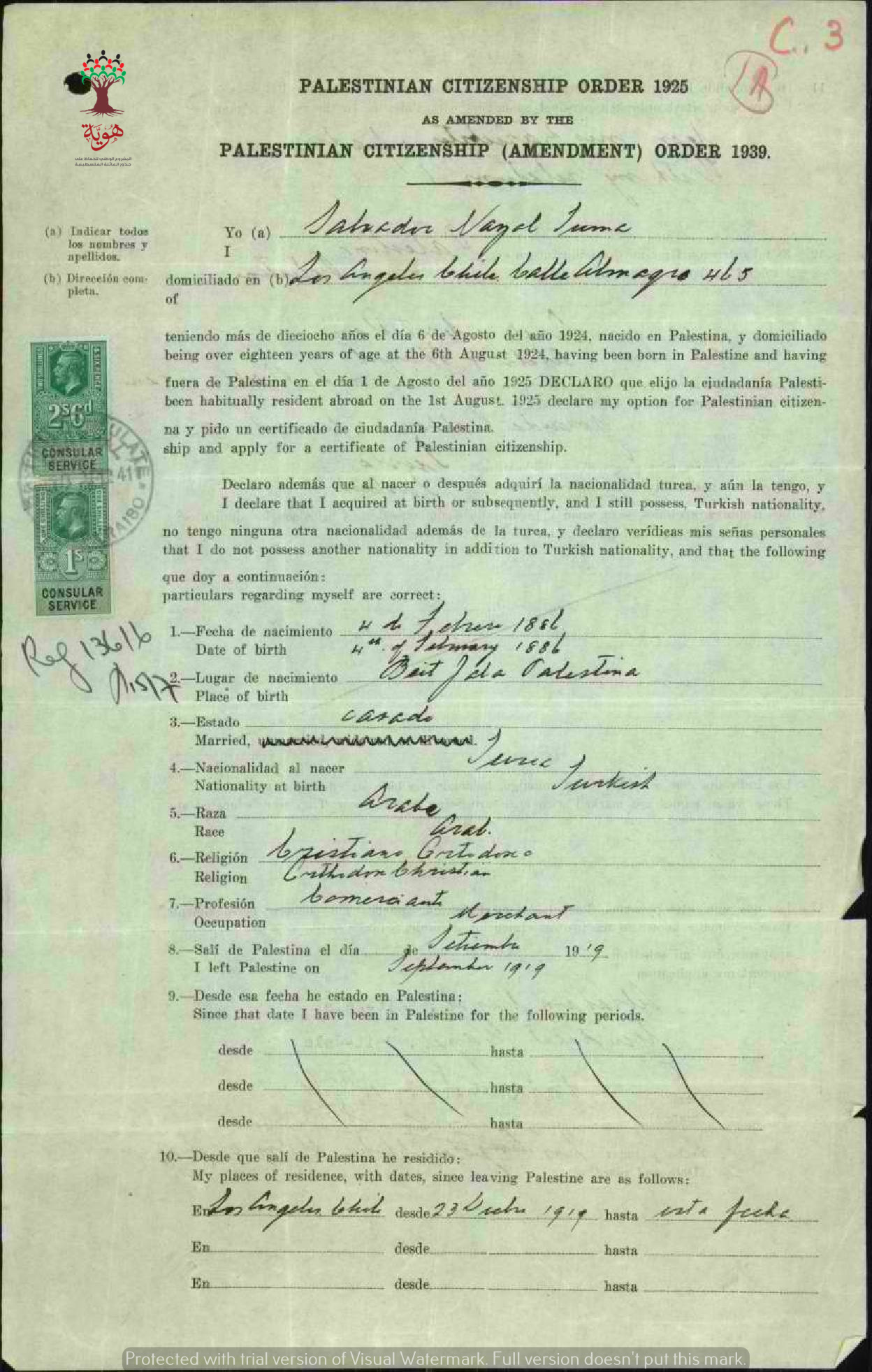 طلب الجنسية الفلسطينية-سلفادور نزال-بيت جالا/تشيلي