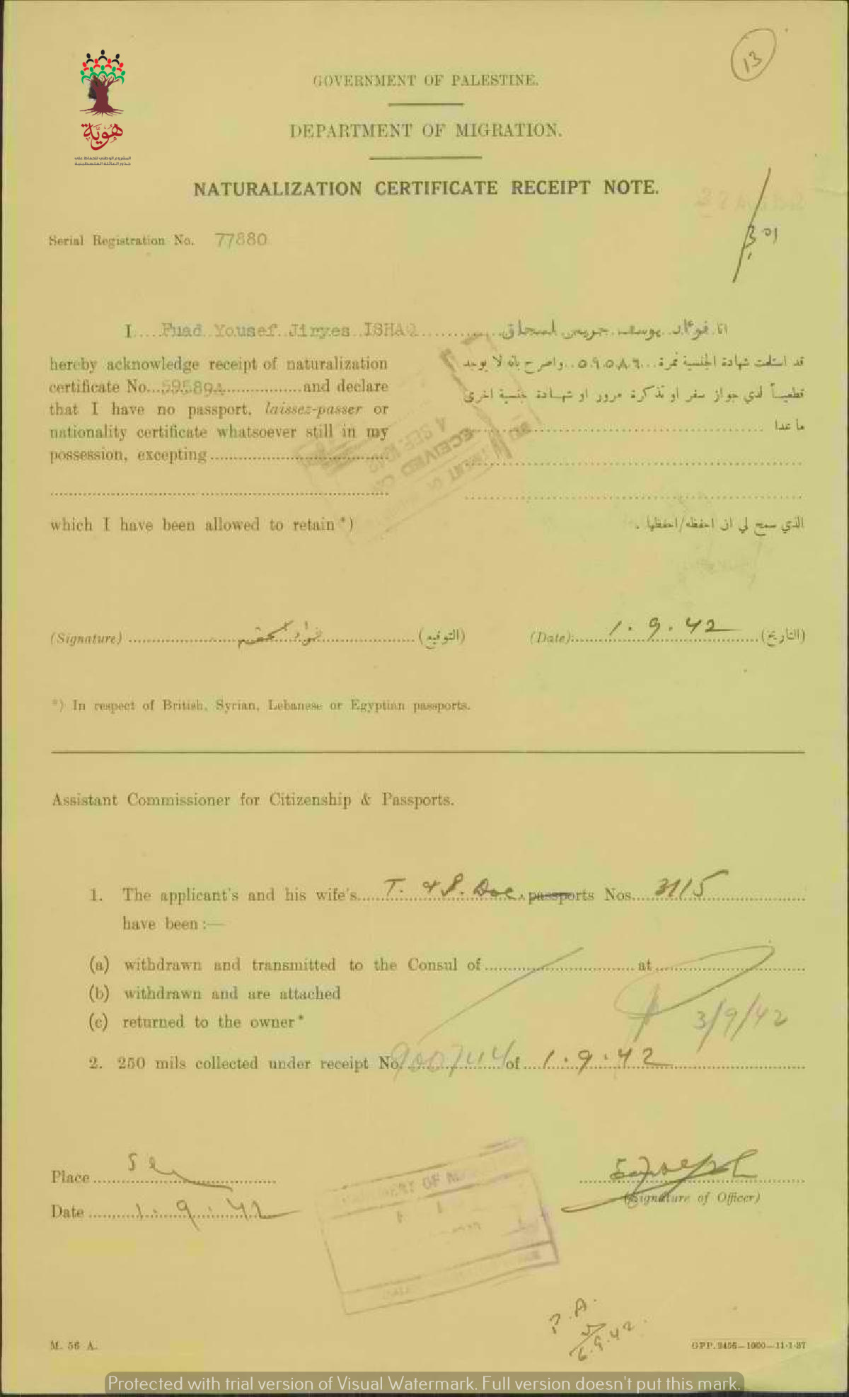 إيصال موقع من فؤاد إسحق باستلام شهادة الجنسية الفلسطينية