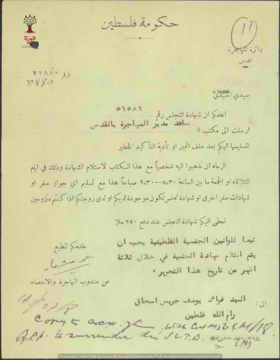 رسالة من مندوب المهاجرة والإحصاء الى فؤاد إسحق للحصول على شهادة الجنسية الفلسطينية