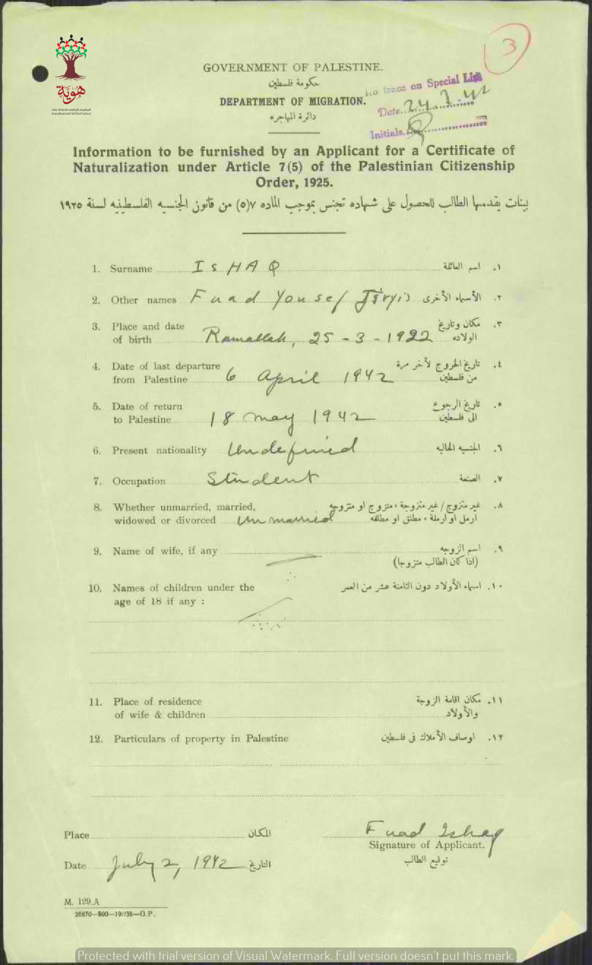 ورقة بيانات فؤاد إسحق المرفقة بطلب الجنسية