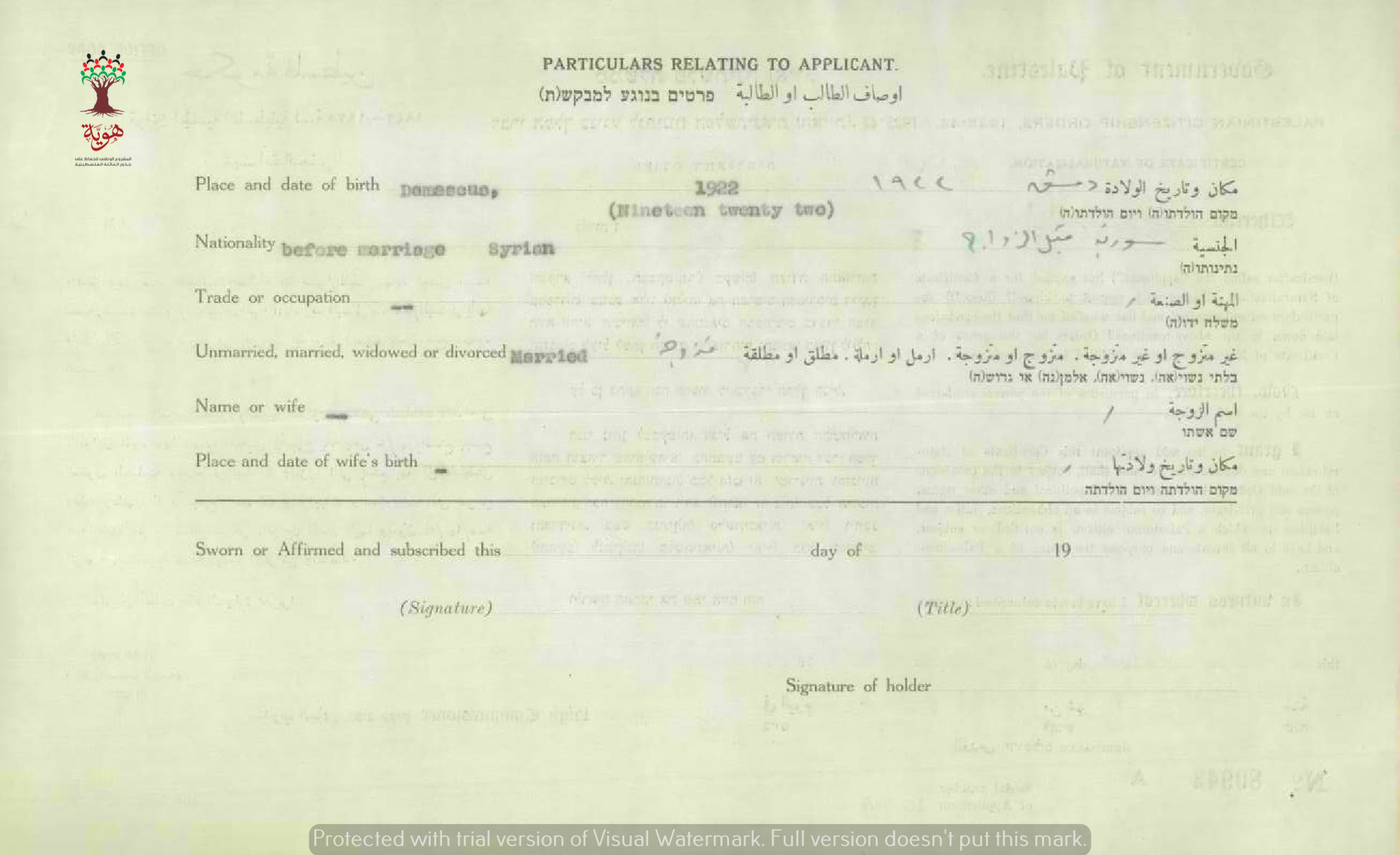 شهادة الجنسية الفلسطينية ل وداد جوخي بكداش