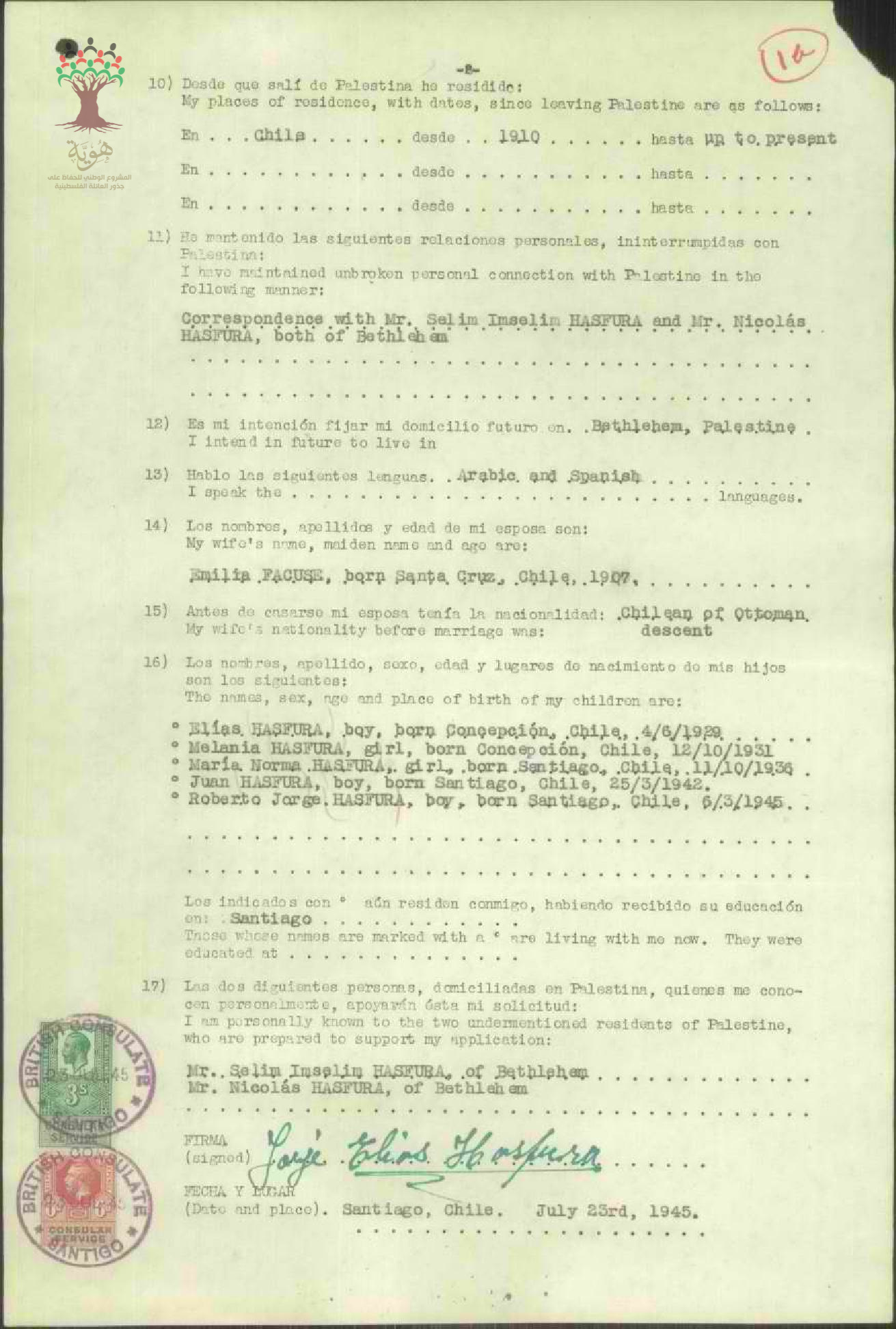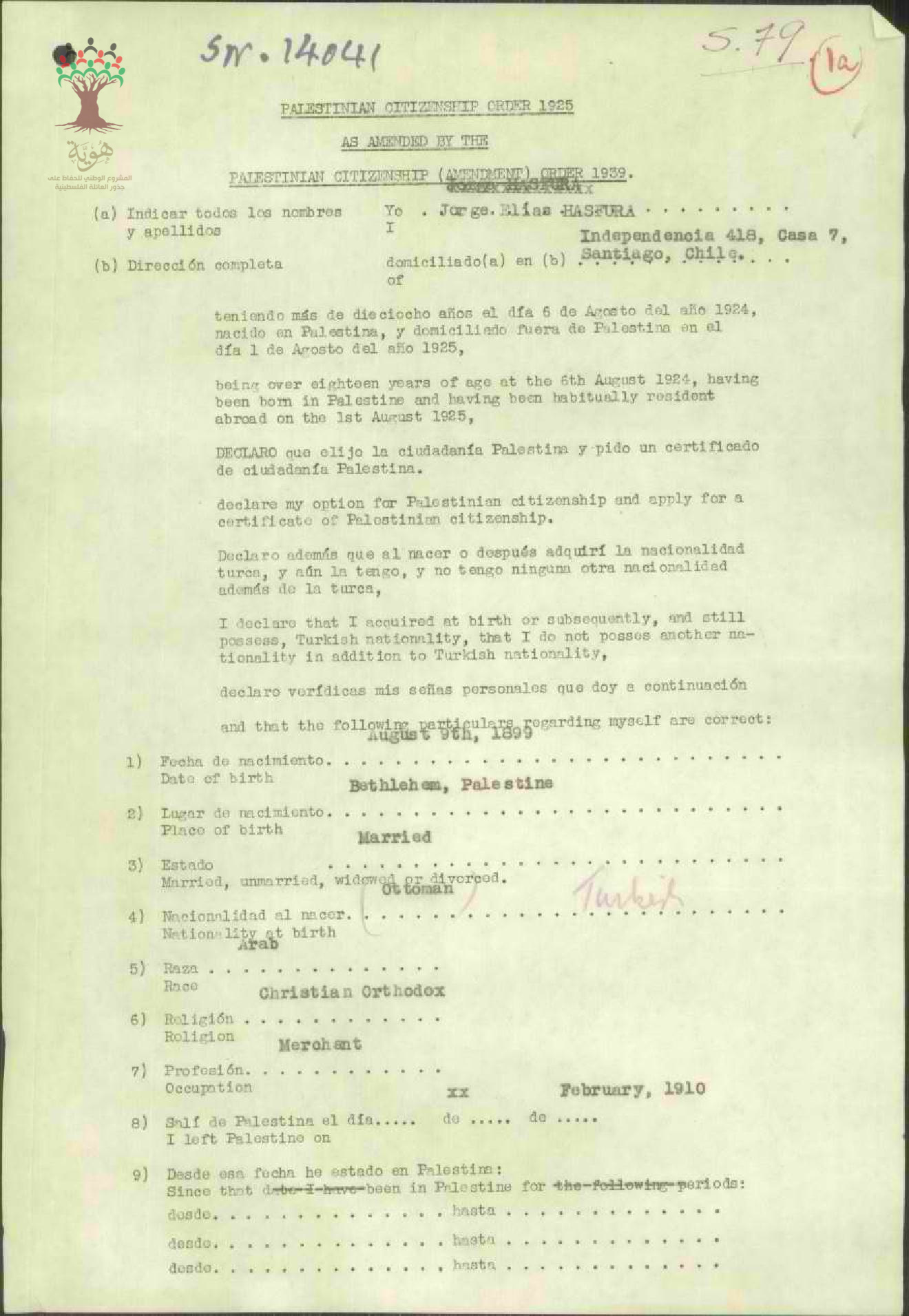 طلب الجنسية الفلسطينية- جورج إلياس عصفورة - بيت لحم/تشيلي