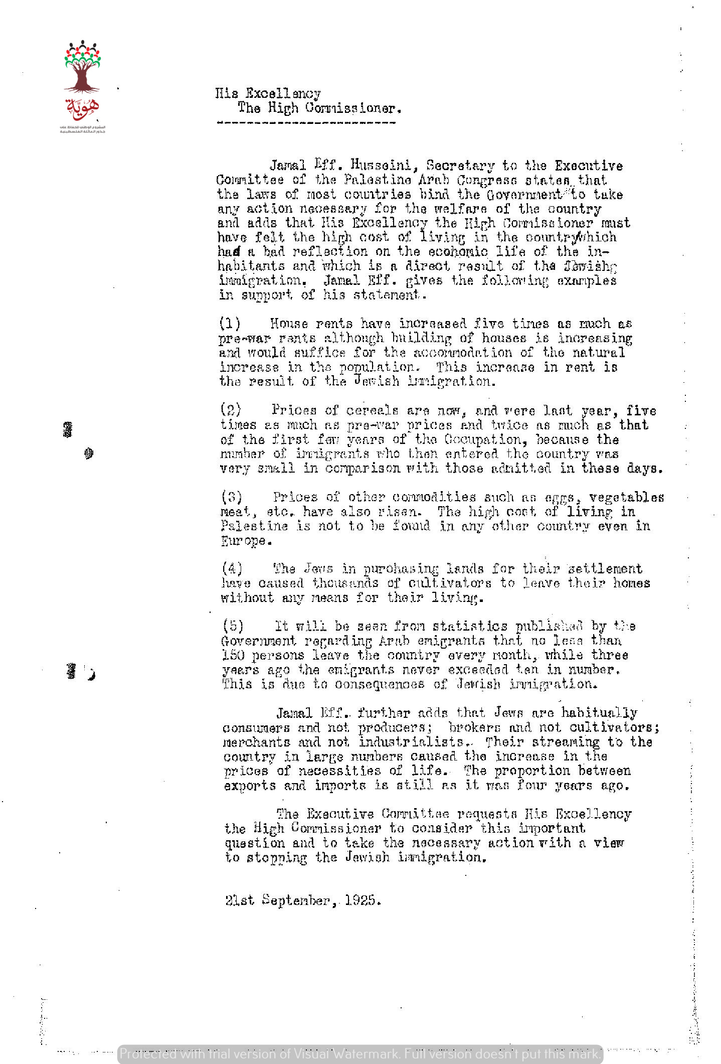 رسالة احتجاج من المؤتمر العربي الفلسطيني الى المندوب السامي احتجاجا على هجرة اليهود الى فلسطين وما ينتج عن هذه الهجرة من غلاء اجار البيوت والحنطة وبالتالي غلاء معيشي كامل وما الى ذلك من تبعات على الإقتصاد كافة.