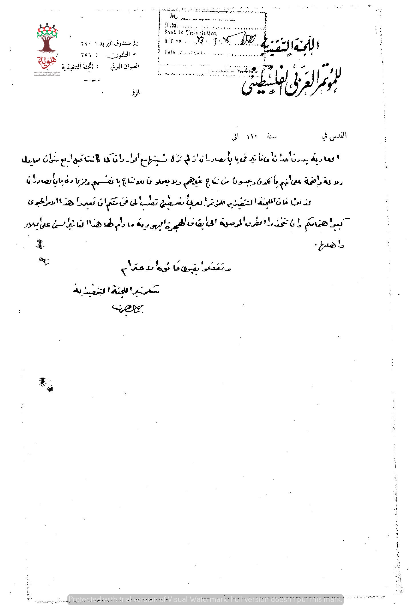 رسالة احتجاج من المؤتمر العربي الفلسطيني الى المندوب السامي احتجاجا على هجرة اليهود الى فلسطين