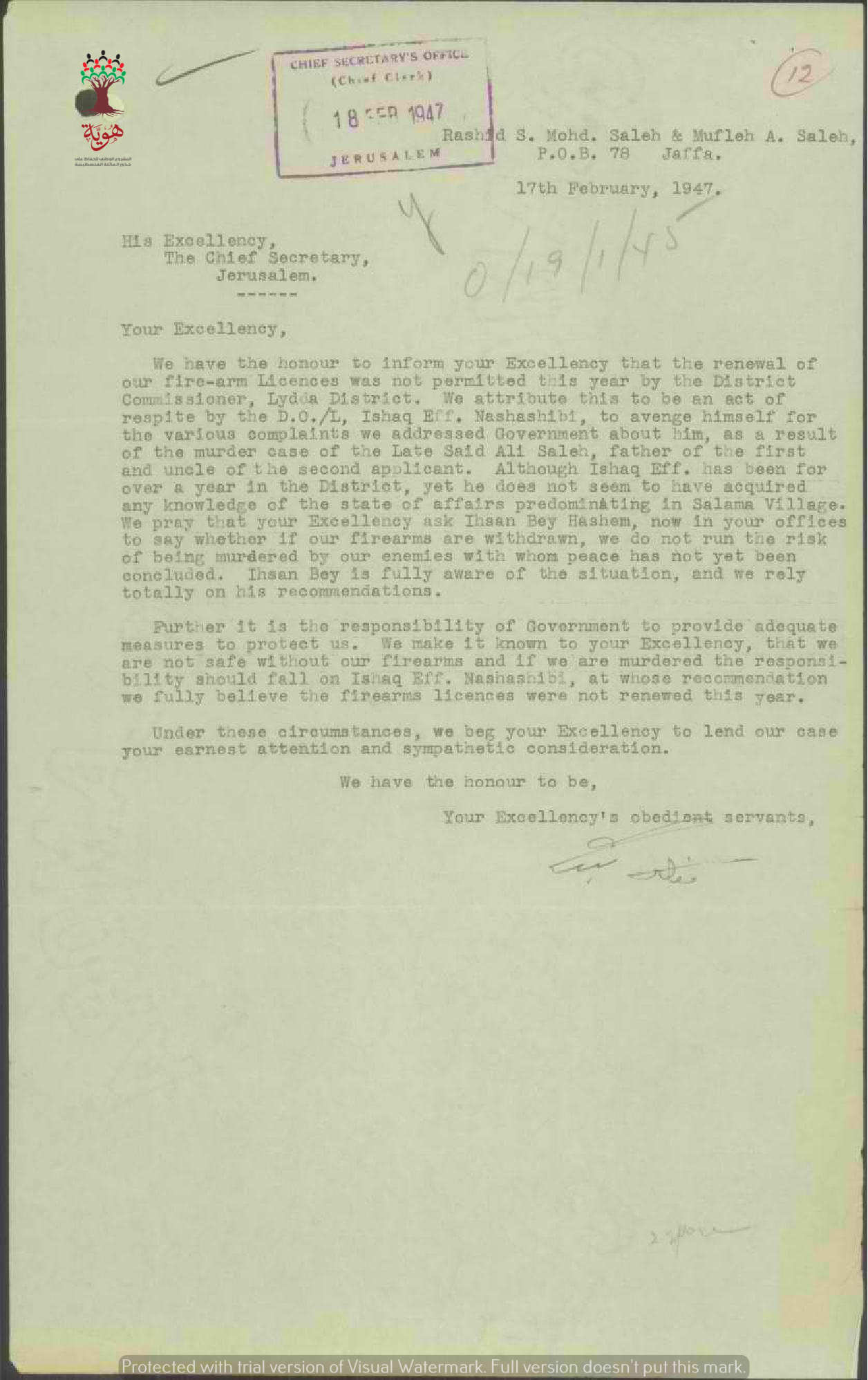 رسالة من محمد الصالح ومفلح الصالح الى سكرتير القائم بأعمال الحكومة يحتجان على عدم تجديد رخص السلاح الخاصة بهم وذلك بعد قتل المدعو إسحق نشاشيبي ل سعيد الصالح والد محمد وعم مفلح وادعائهم عليه عدة مرات.