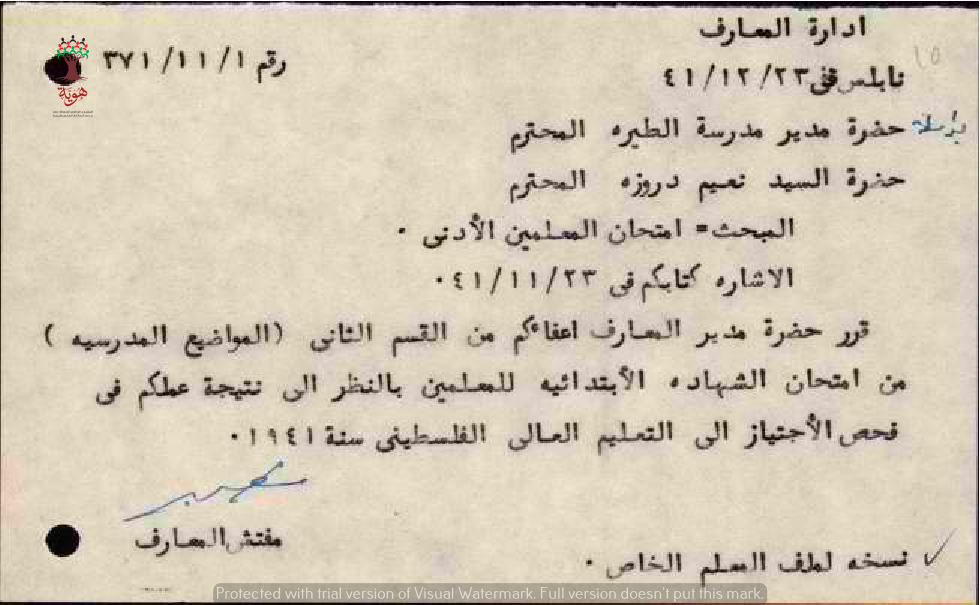 رسالة من مفتش المعارف الى المعلم نعيم دروزة بخصوص اعفائه من القسم الثاني من امتحان المعلمين بسبب اجتيازه فحص التعليم العالي الفلسطيني عام 1941.