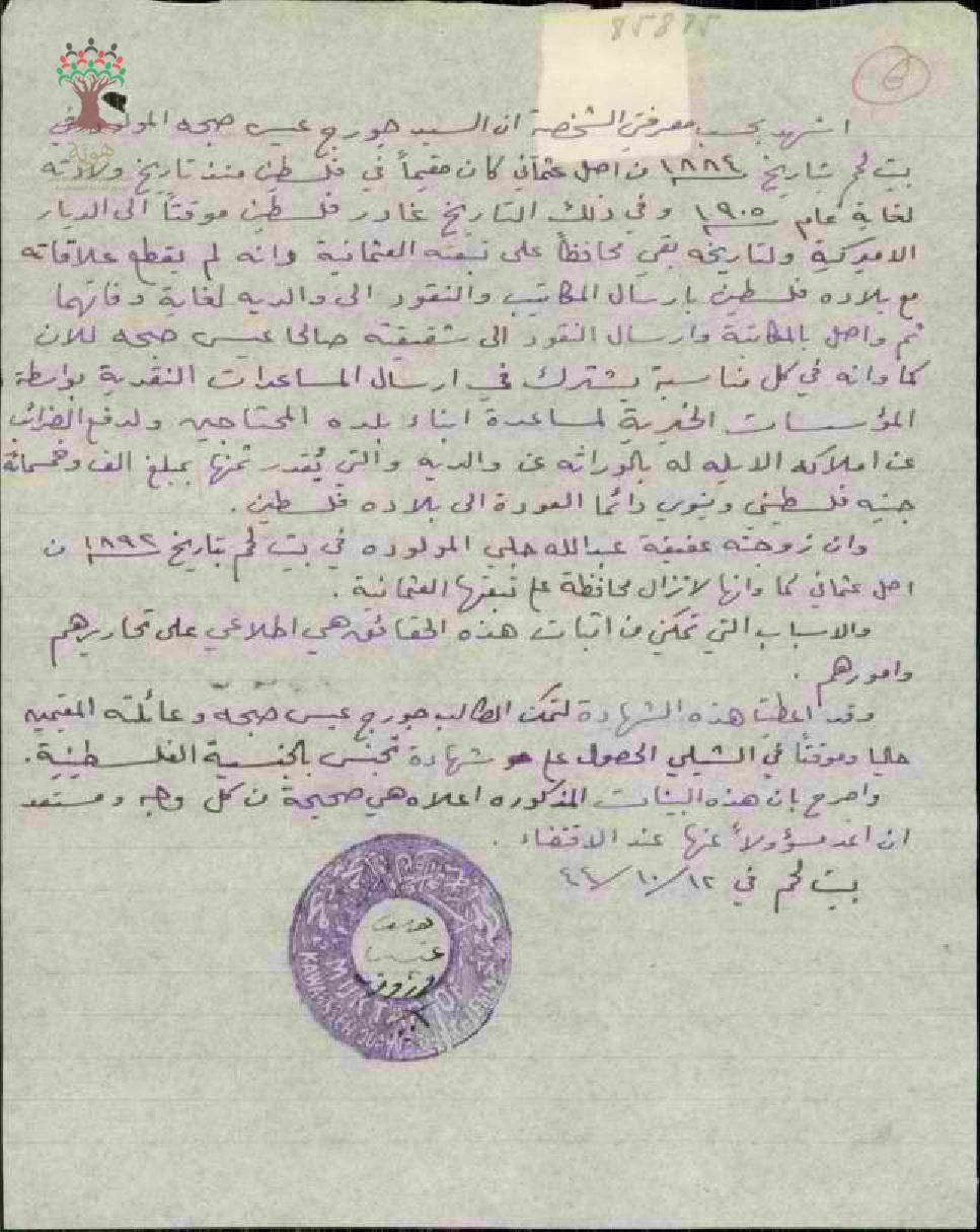 شهادة من المختار يوسف عيسى مرزوق للسيد جورج صبحة بخصوص طلب الجنسية/بيت لحم