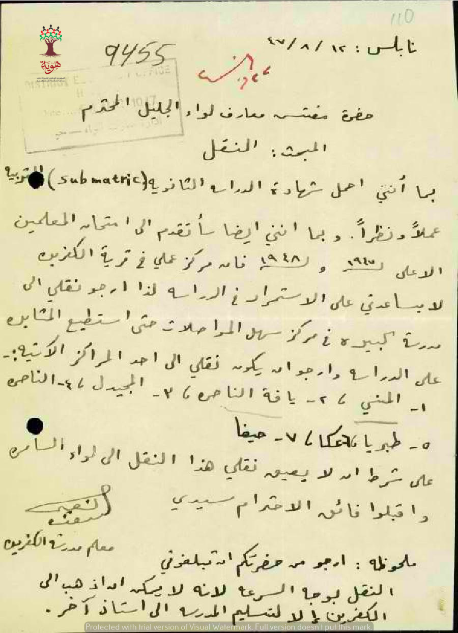 رسالة من المعلم نعيم دروزة الى مفتش المعارف يطلب فيها نقله من مدرسة الكفرين ليتمكن من متابعة دراسته.