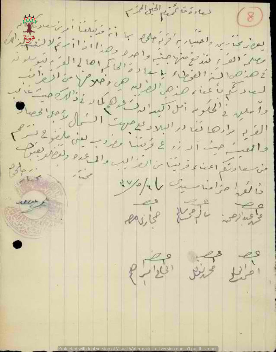 رسالة من مخاتير قرية حلحول الى قائمقام الخليل يطالبون بإعفاء أهالي القرية من الضريبة.