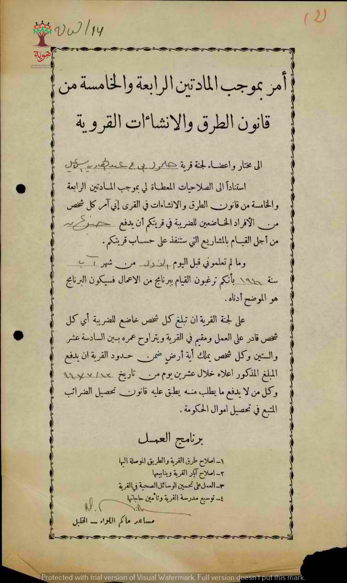 أمر صادر عن حاكم لواء الخليل بالمبلغ المترتب على أهالي قرية حلحول لأعمال الاصلاحات في القرية