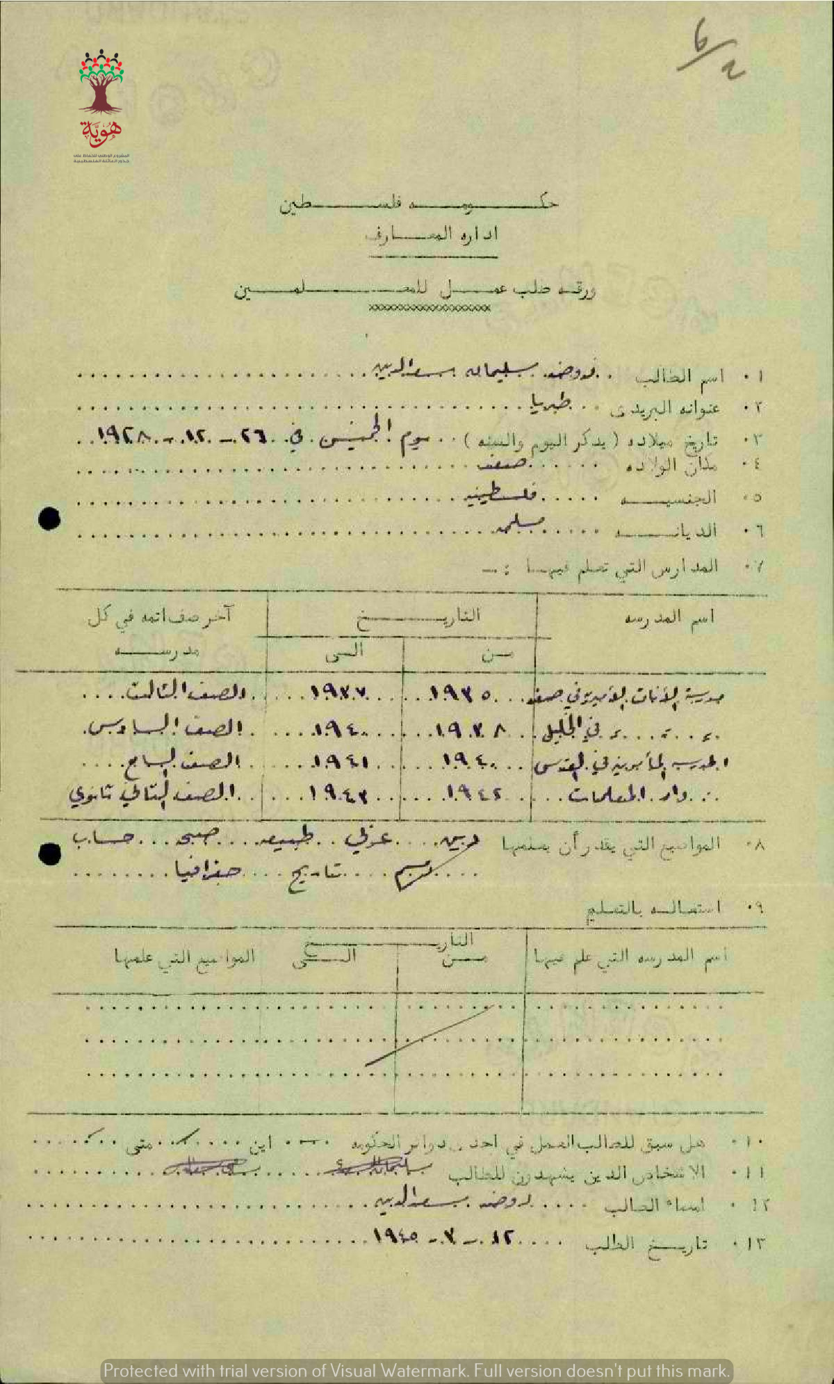 ورقة طلب عمل مقدمة من المعلمة روضة سليمان سعد الدين- مدرسة طبريا